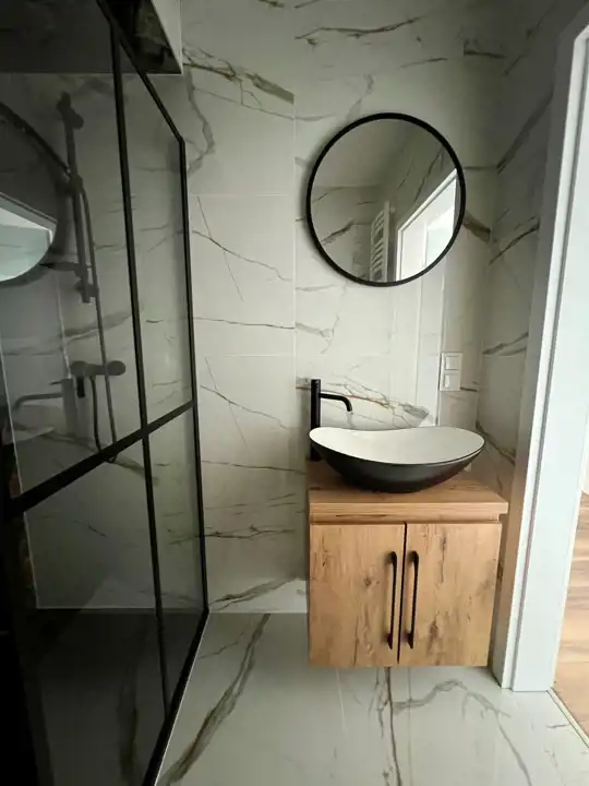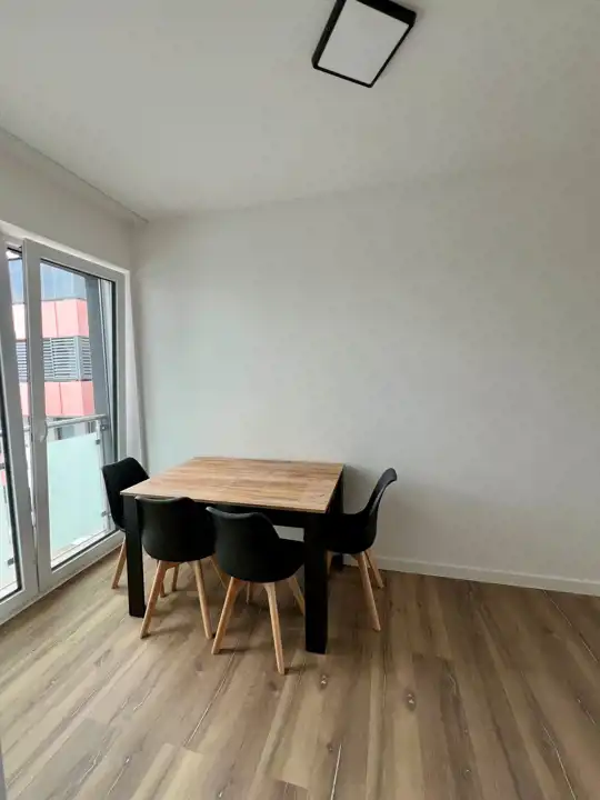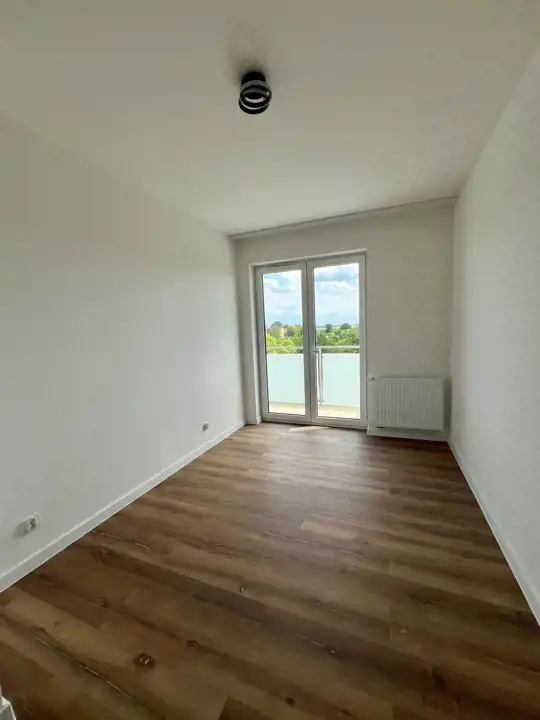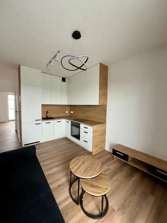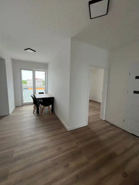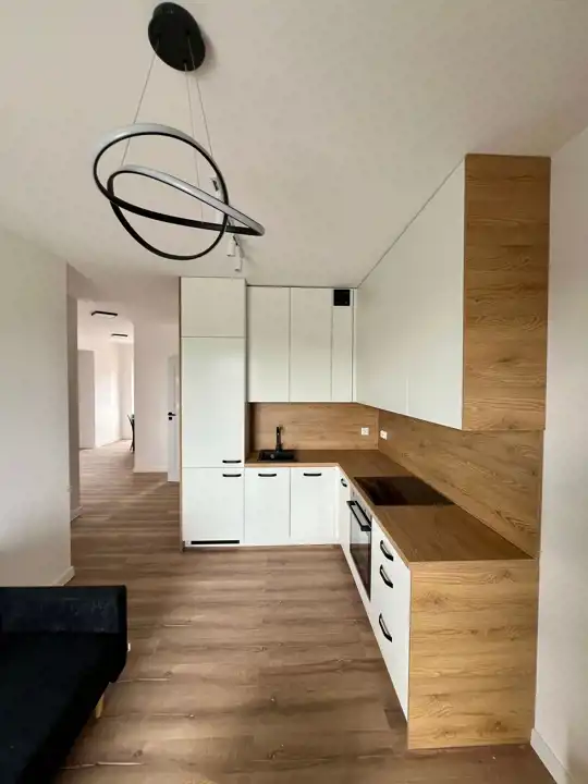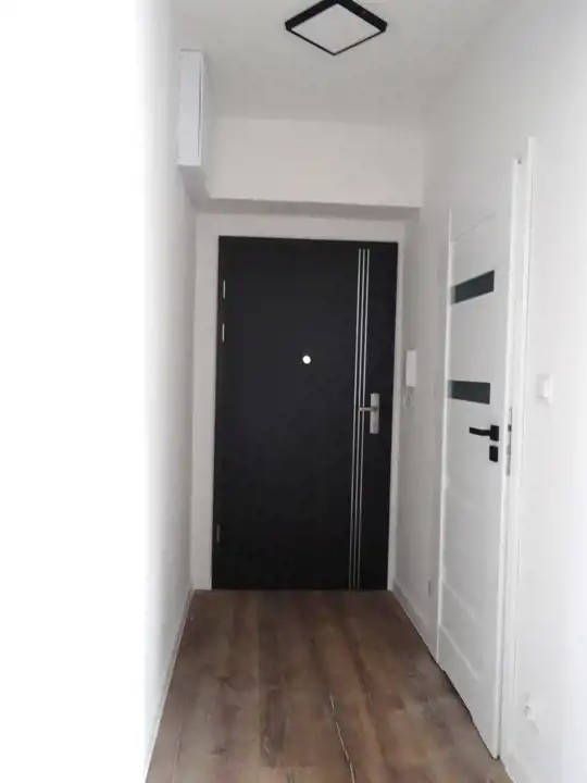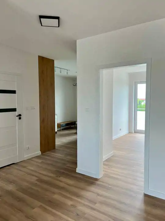 Mieszkanie jest przestronne, słoneczne a pokoje ustawne i funkcjonalne. Na ścianach gładzie, farby i kafle, natomiast podłogi wyłożone panelami i terakotą dobrego gatunku. W salonie znajduje się wygodna sofa, stoliki kawowe oraz szafka RTV, aneks kuchenny zabudowany został funkcjonalną, nowoczesną kuchnią. Całość utrzymana jest w spokojnej ciepłej kolorystyce bieli i drewna, natomiast łazienka to elegancja, szyk i nowoczesny design w bieli i czerni z dodatkami drewna.