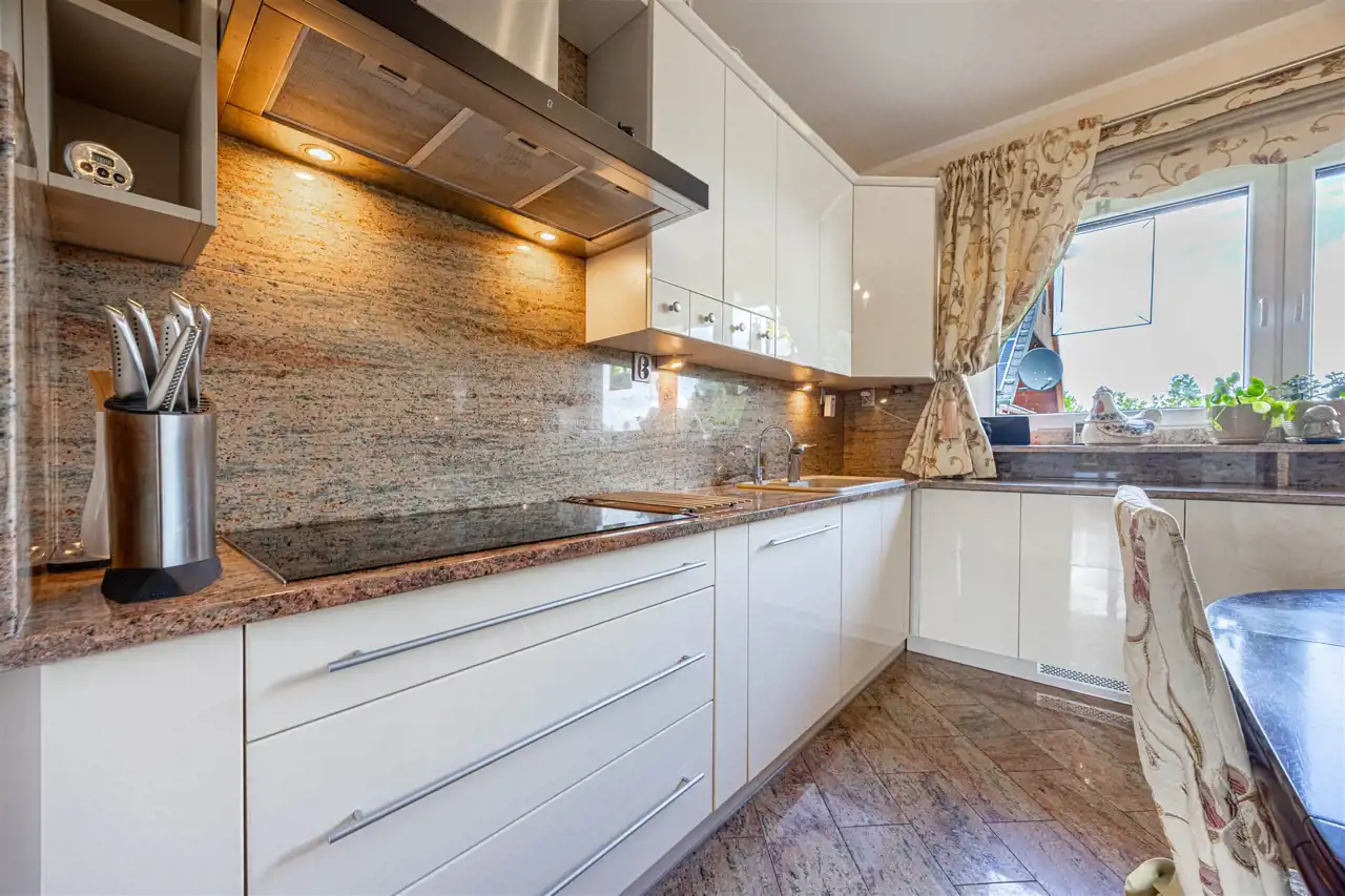 Niepowtarzalne płyty granitowe na podłodze , blatach kuchennych , fartuchach oraz parapetach. Bardzo zadbany parkiet. Działka otoczona płotem oraz bramą na pilota.