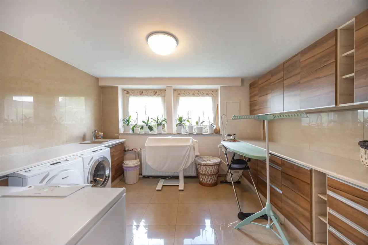- Parter - pokój gościnny, garderoba, łazienka, pokój pełniący funkcje warsztatu artystycznego, kotłownia, pralnia, spiżarnia, garaż .