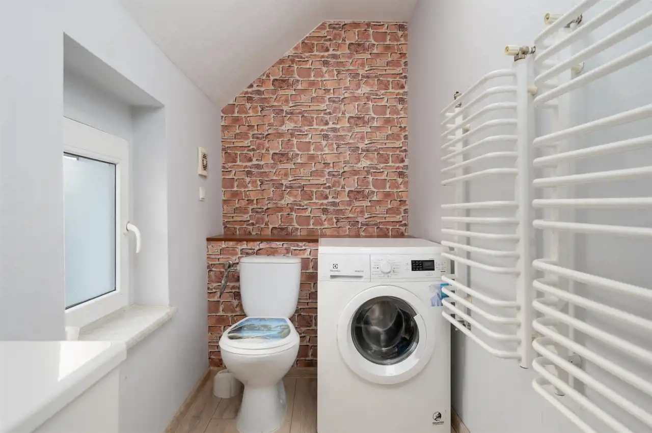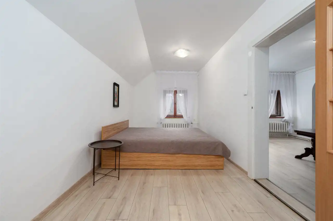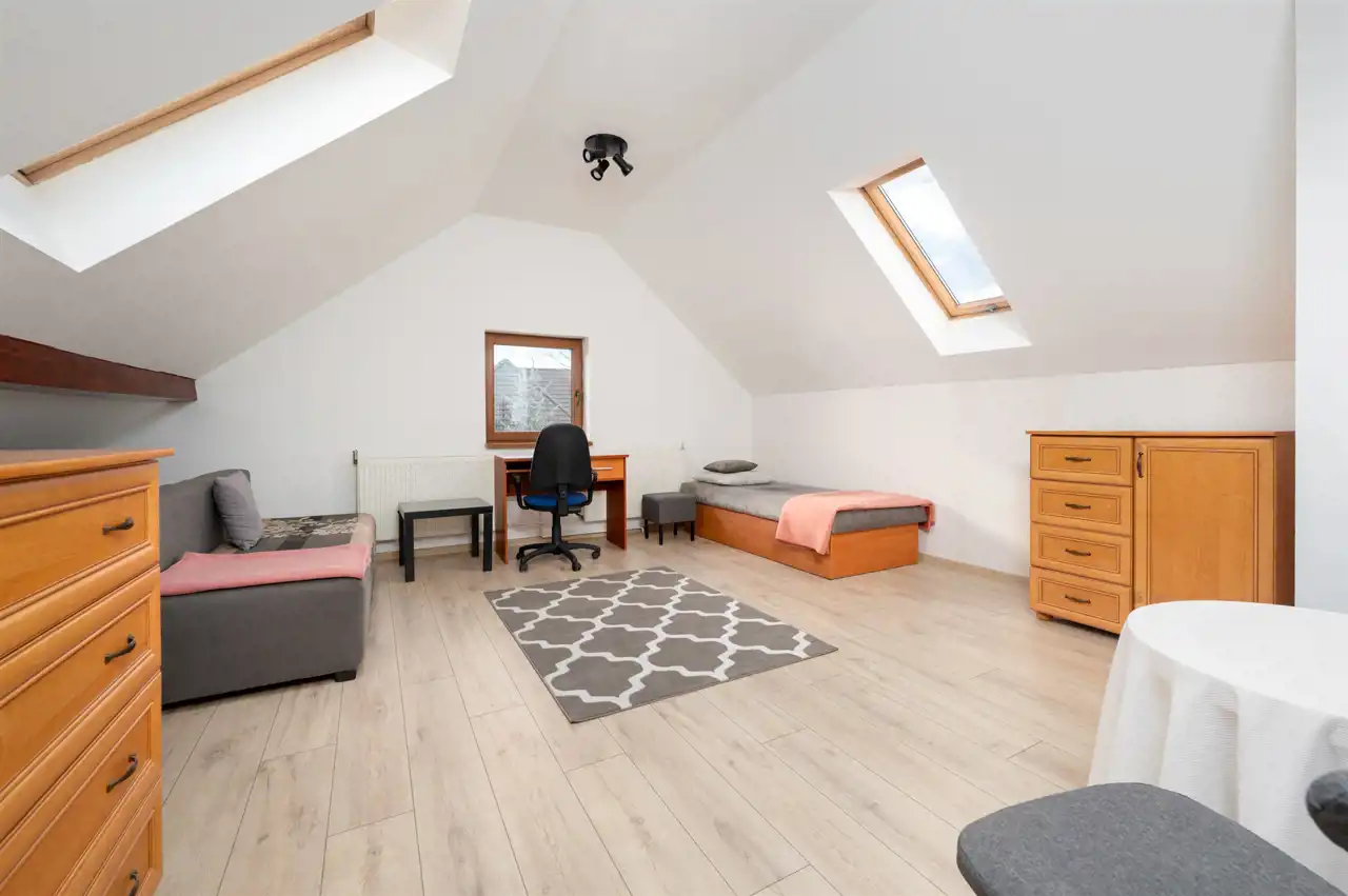 Drugą część stanowi lokal zajmujący pierwsze piętro i poddasze — idealny jako samodzielne mieszkanie lub uzupełnienie całości domu (komfortowa komunikacja pomiędzy 1 i 2 lokalem).