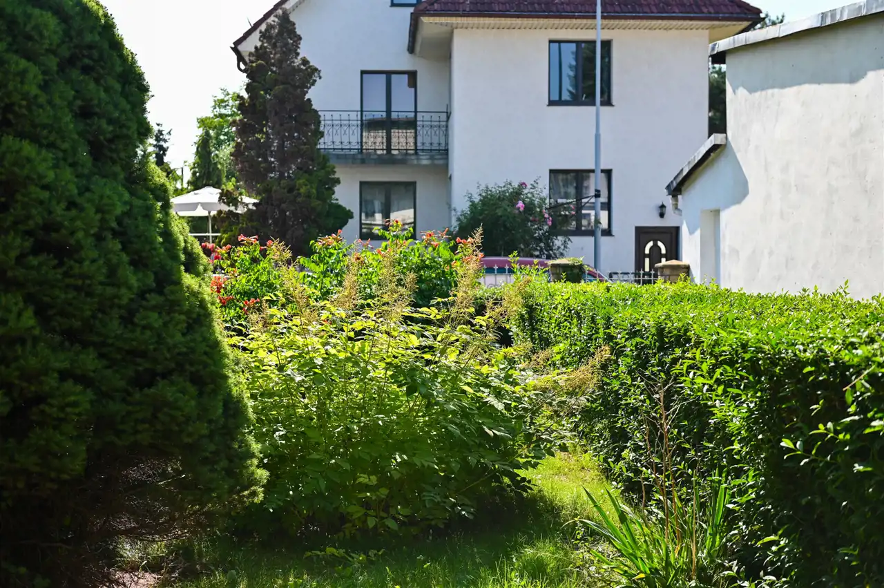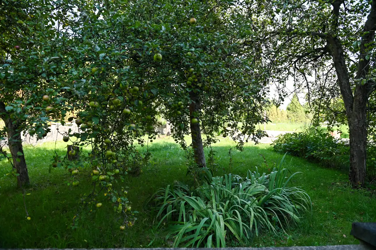 - Ogród z licznymi nasadzeniami: wiśnie, jabłonie, grusza.
