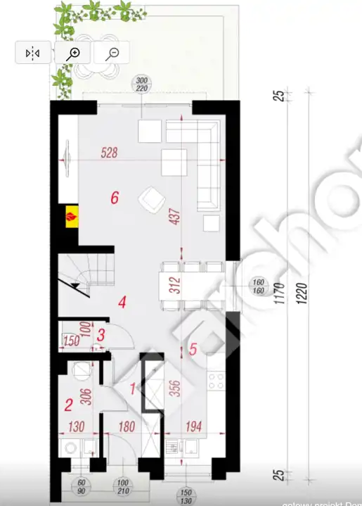 kuchnia z jadalnią - 12,03 m² połączona salonem - 25,49 m² i wyjściem na ogródek.