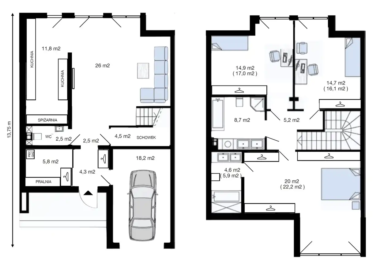 - Garaż (możliwość wejścia bezpośrednio z garażu do domu).
