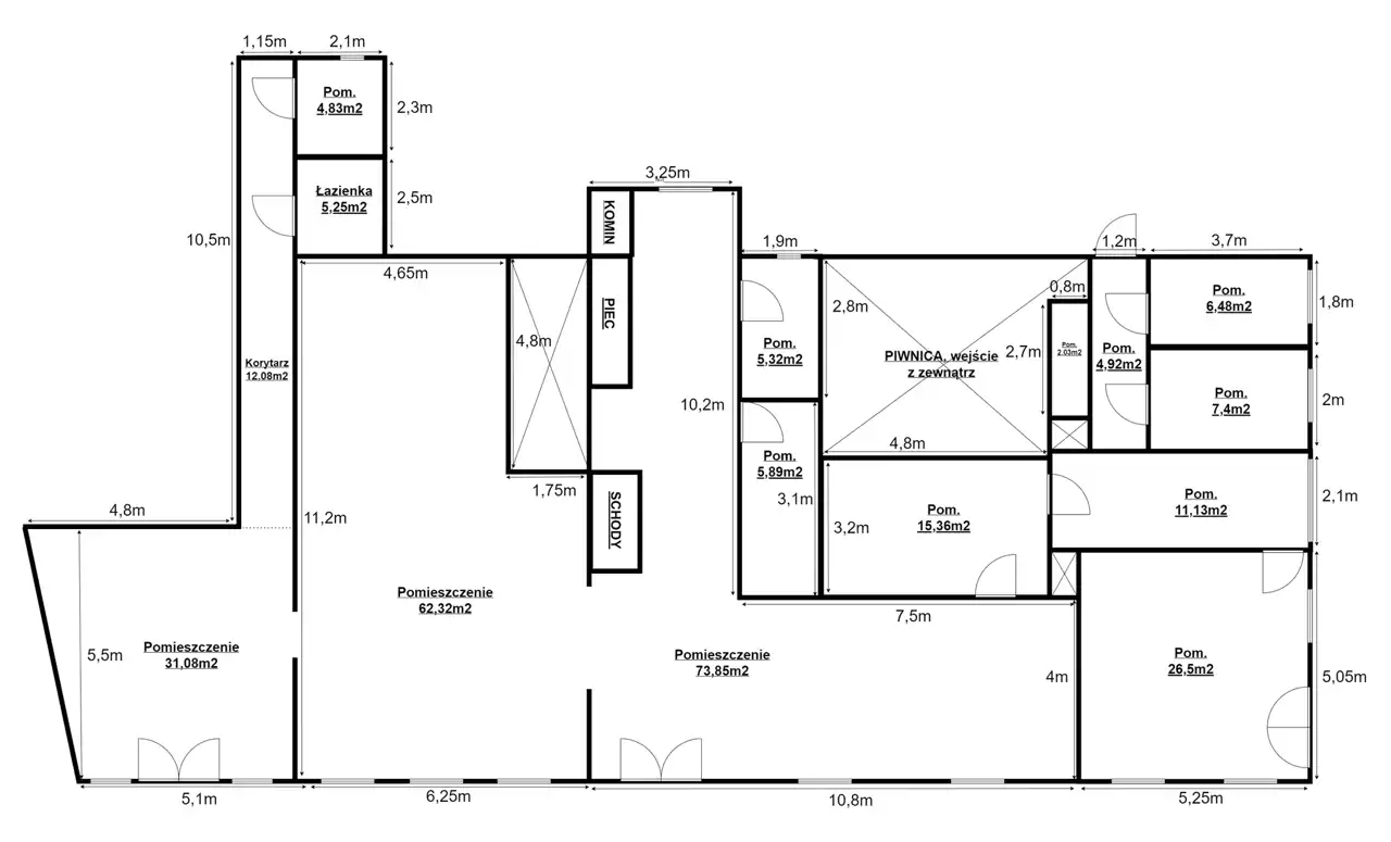 - Piwnica wewnątrz budynku – pow. 10,82m2, wysokość 1,6-1,9m.