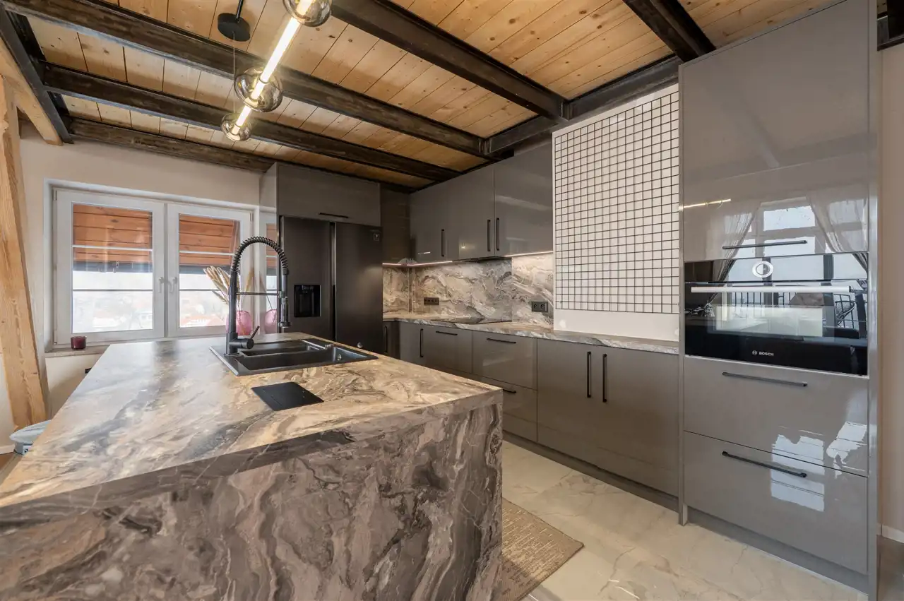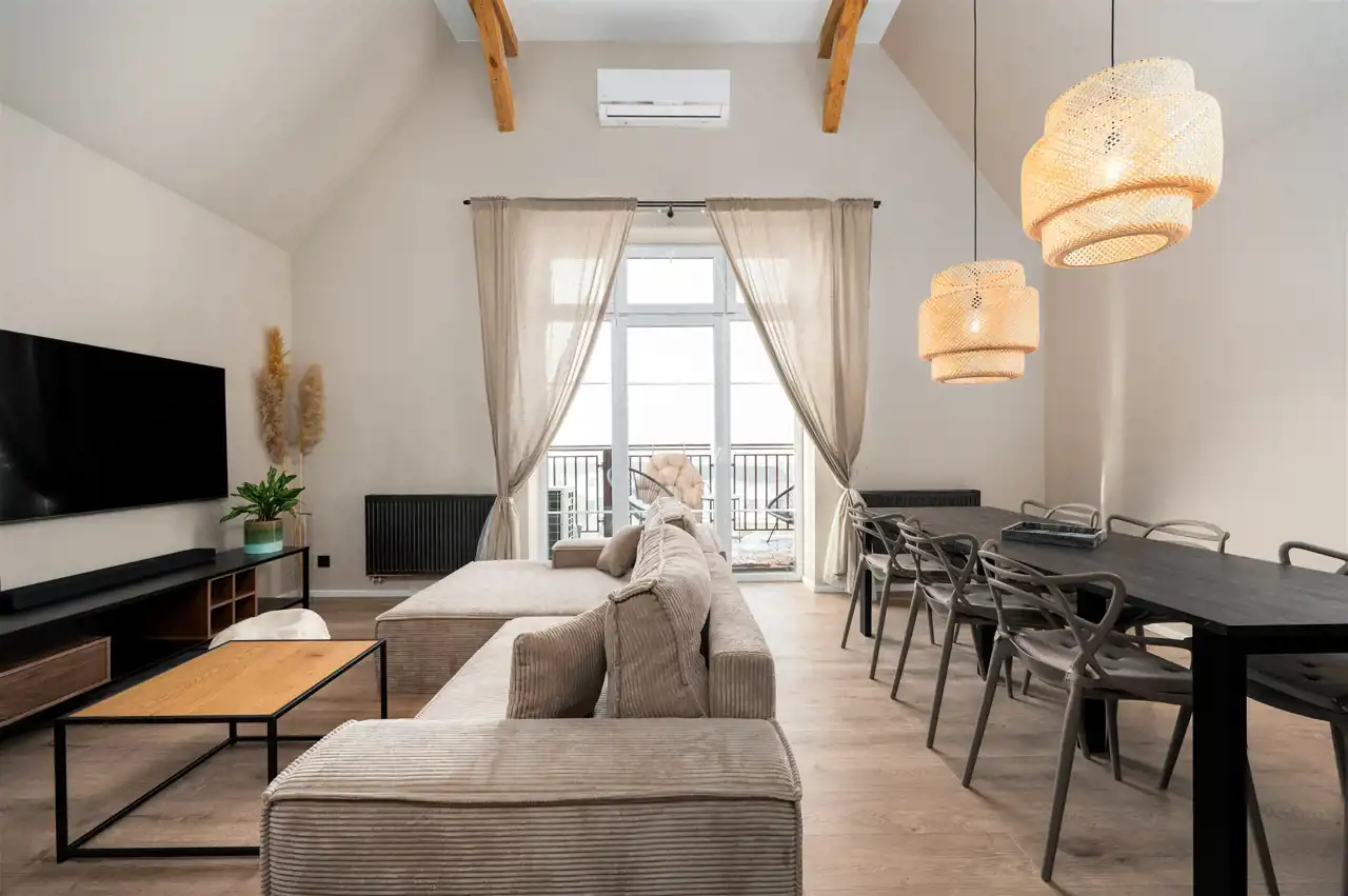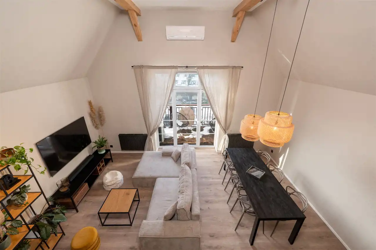 - bardzo duży, przestronny salon z aneksem kuchennym (wejście na antresolę nad częścią kuchenną). Z salonu mamy też wyjście na balkon z pięknym widokiem na góry.