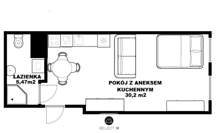 • Przestronny pokój z aneksem kuchennym (30,2 m²);