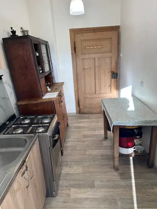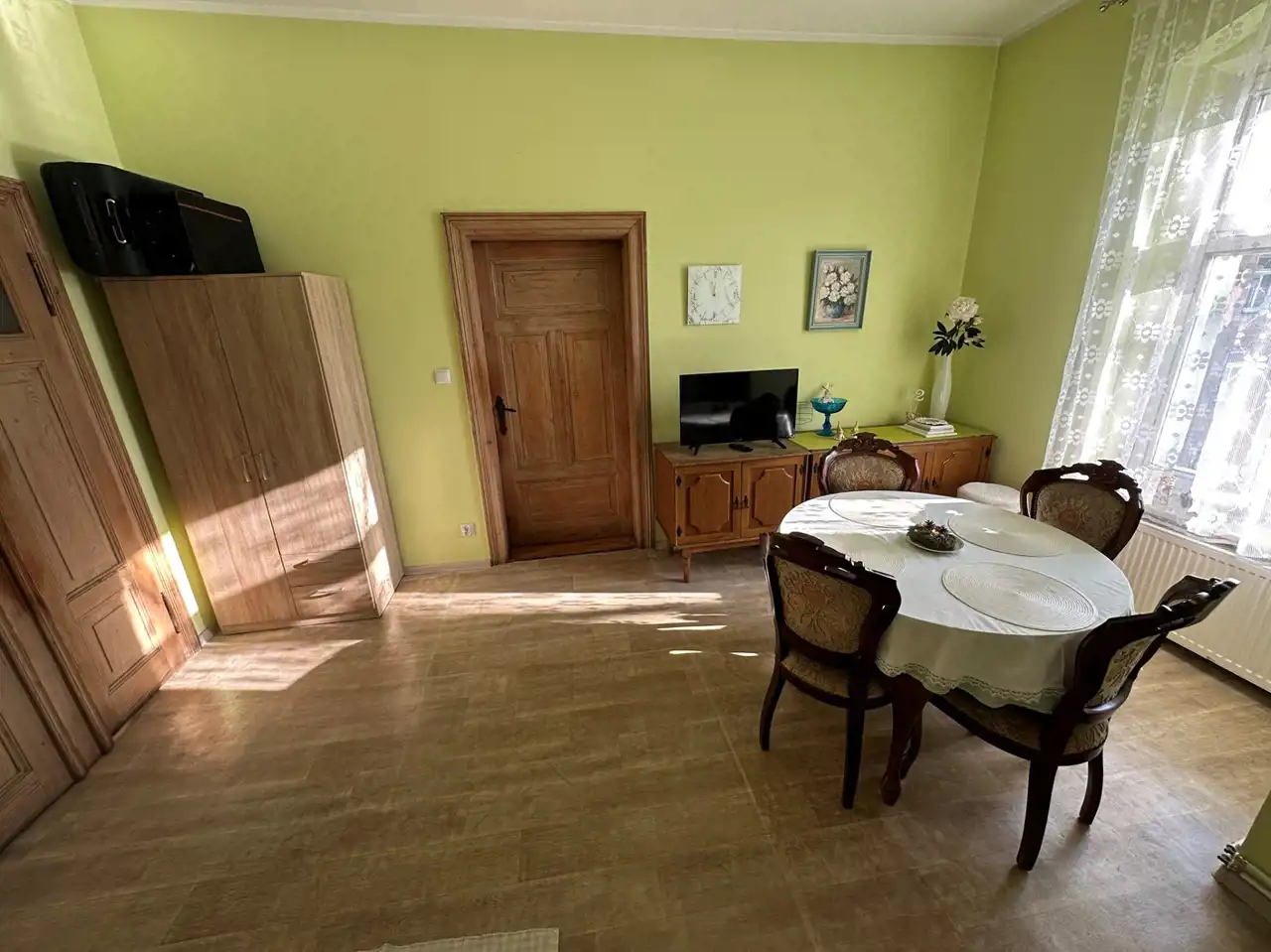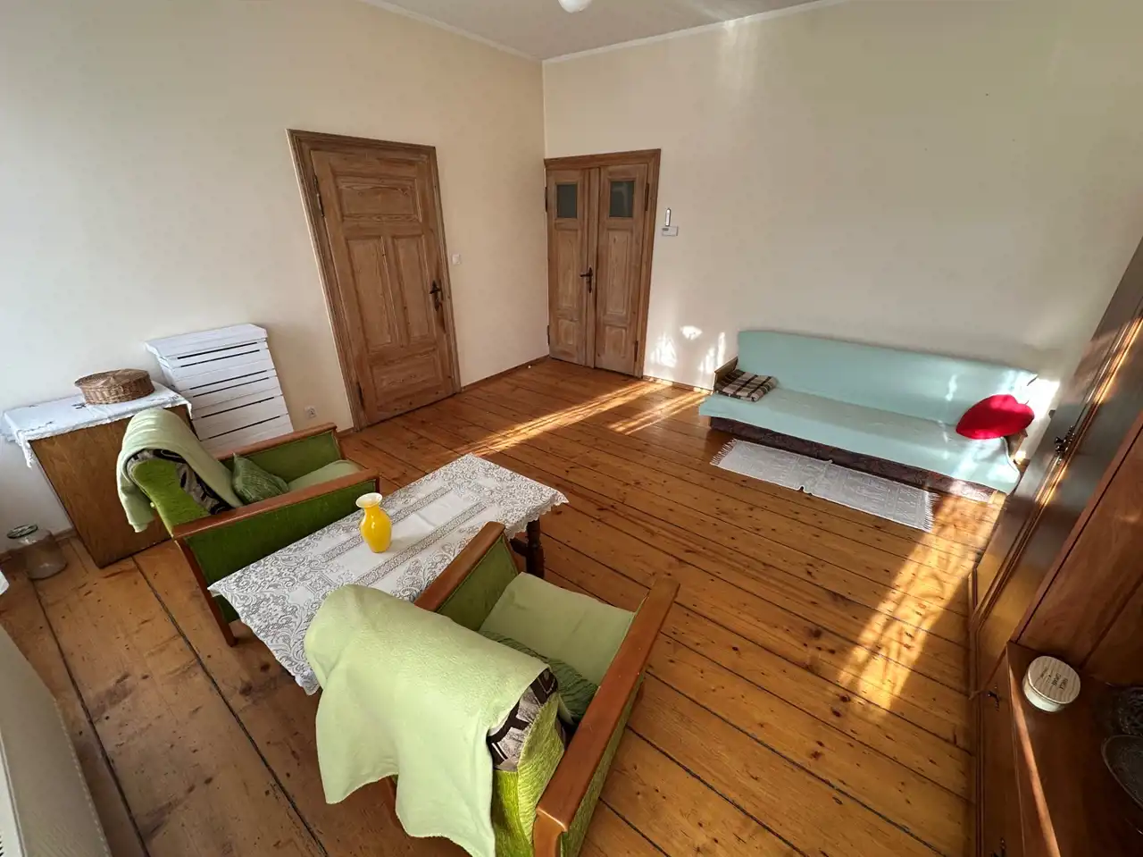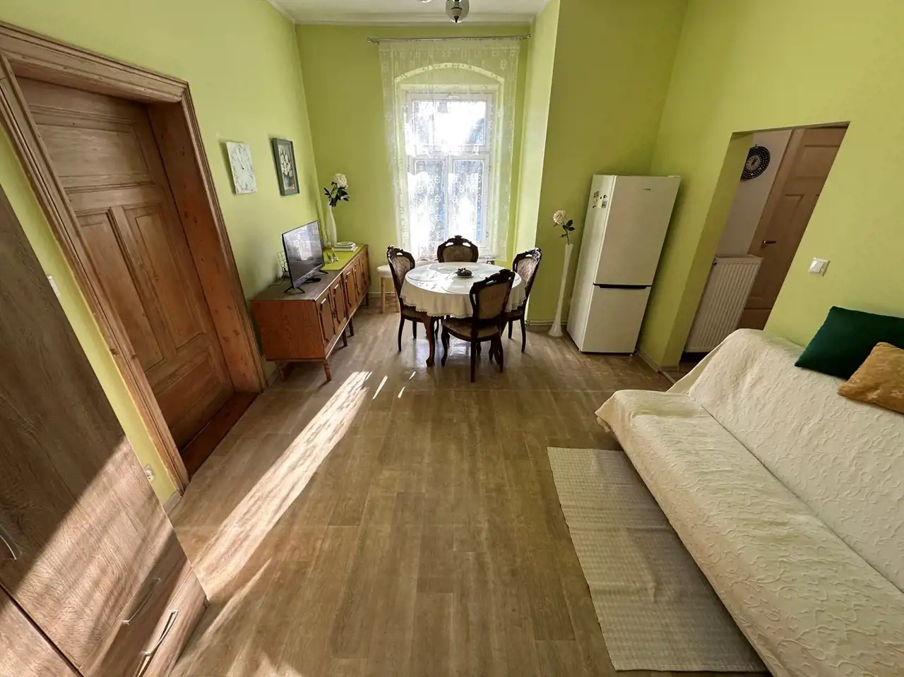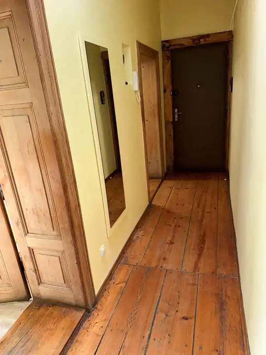 Mieszkanie bardzo klimatyczne, właściciel pozostawił piękne stare deski na podłogach (w mniejszym pokoju i w kuchni są przykryte wykładziną PCV), odrestaurował piękne stylowe drewniane drzwi.
