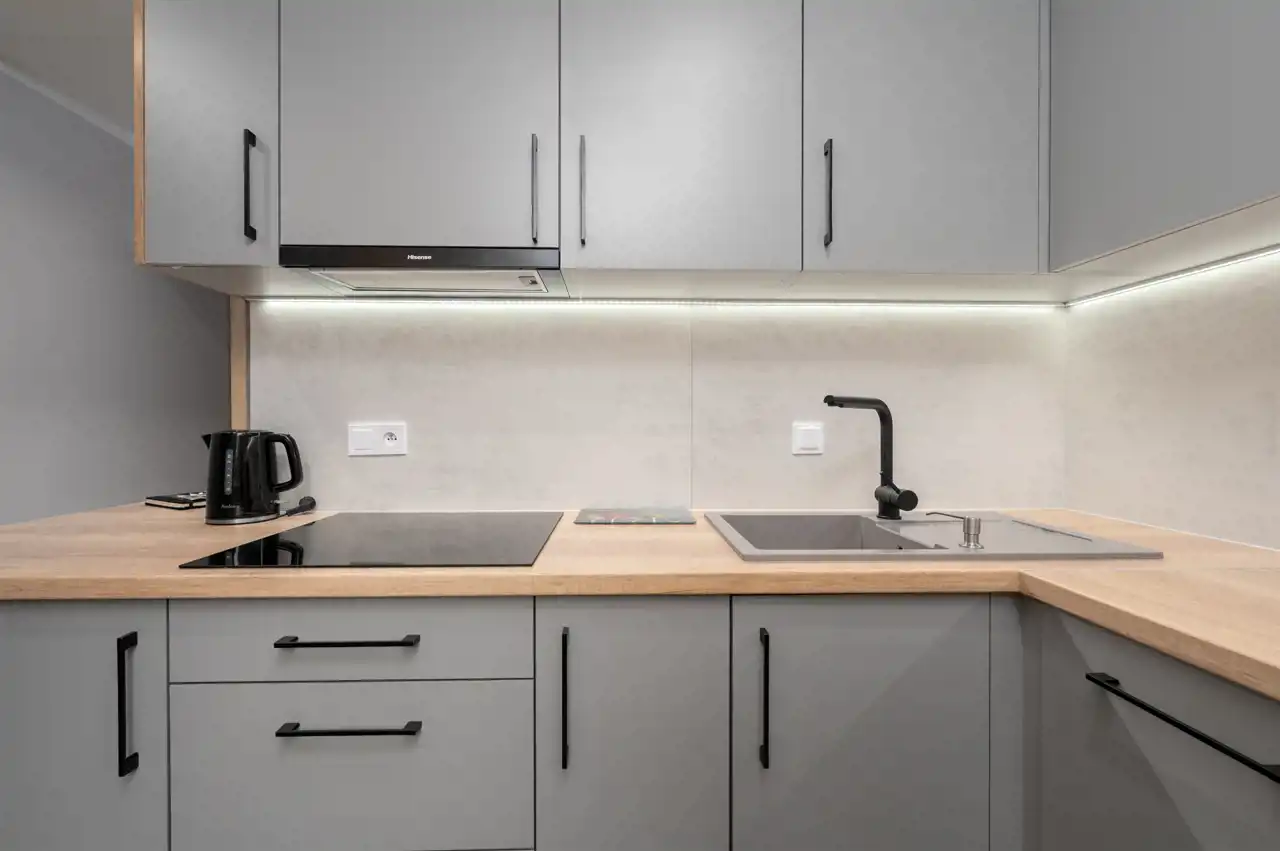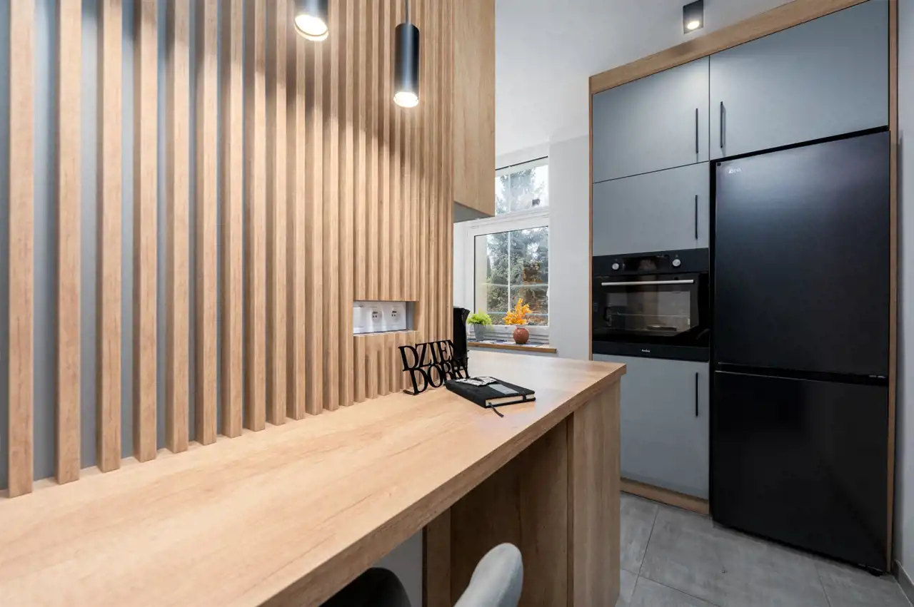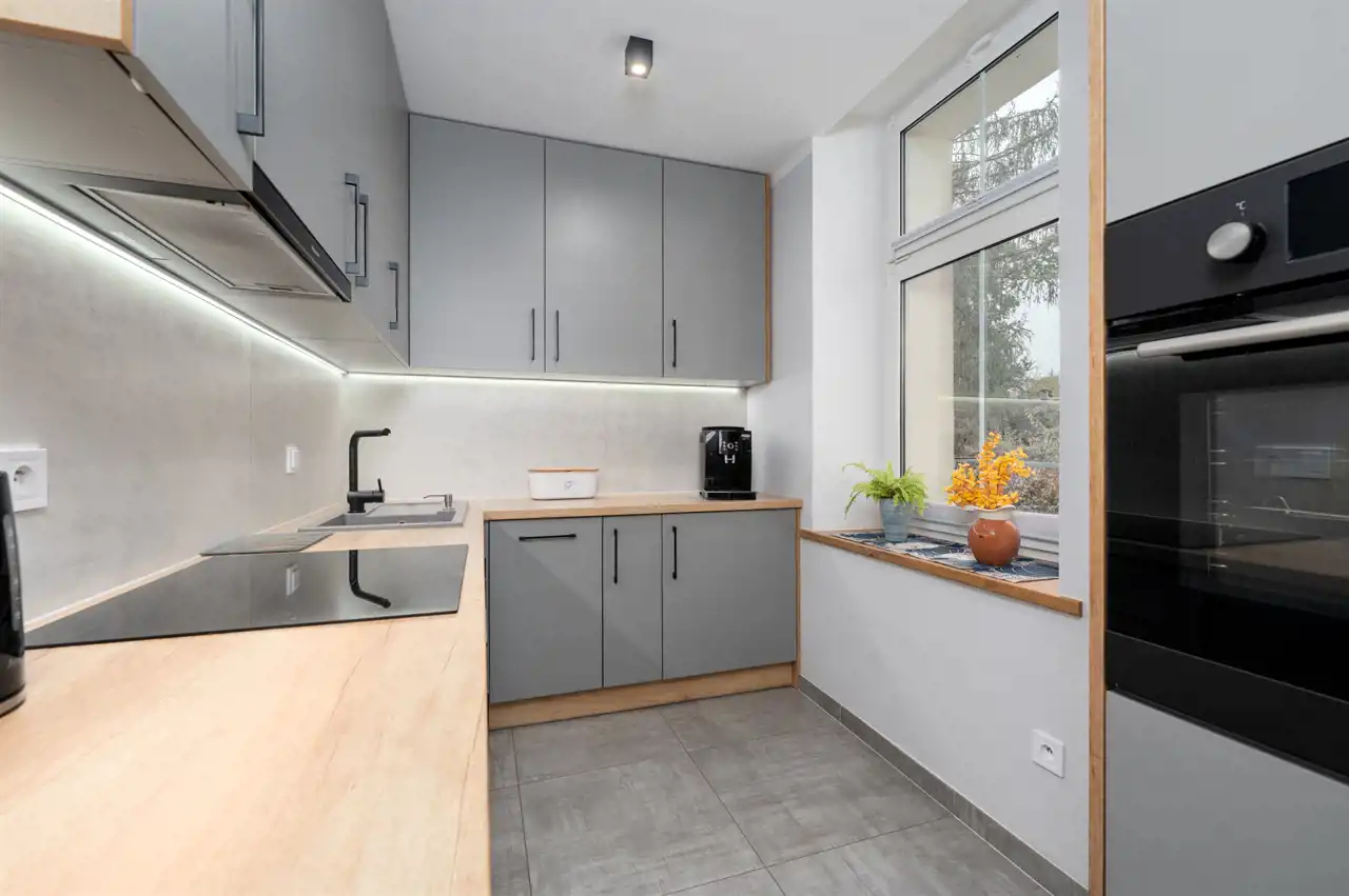 W cenie sprzedaży pozostaje całe widoczne na zdjęciach wyposażenie, w tym: piekarnik, lodówka, płyta indukcyjna, zmywarka, pralka, kuchenka mikrofalowa oraz meble.