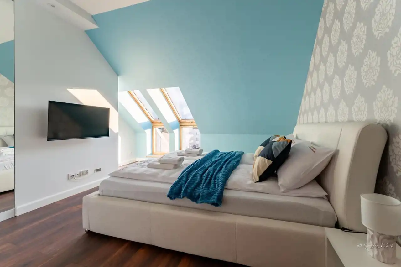 Oddzielna sypialnia: duże łóżko king size, szafa wnękowa i miejsce na relaks.