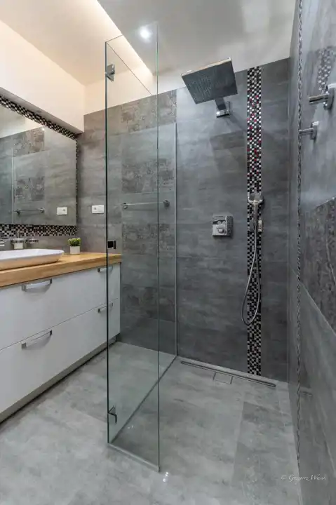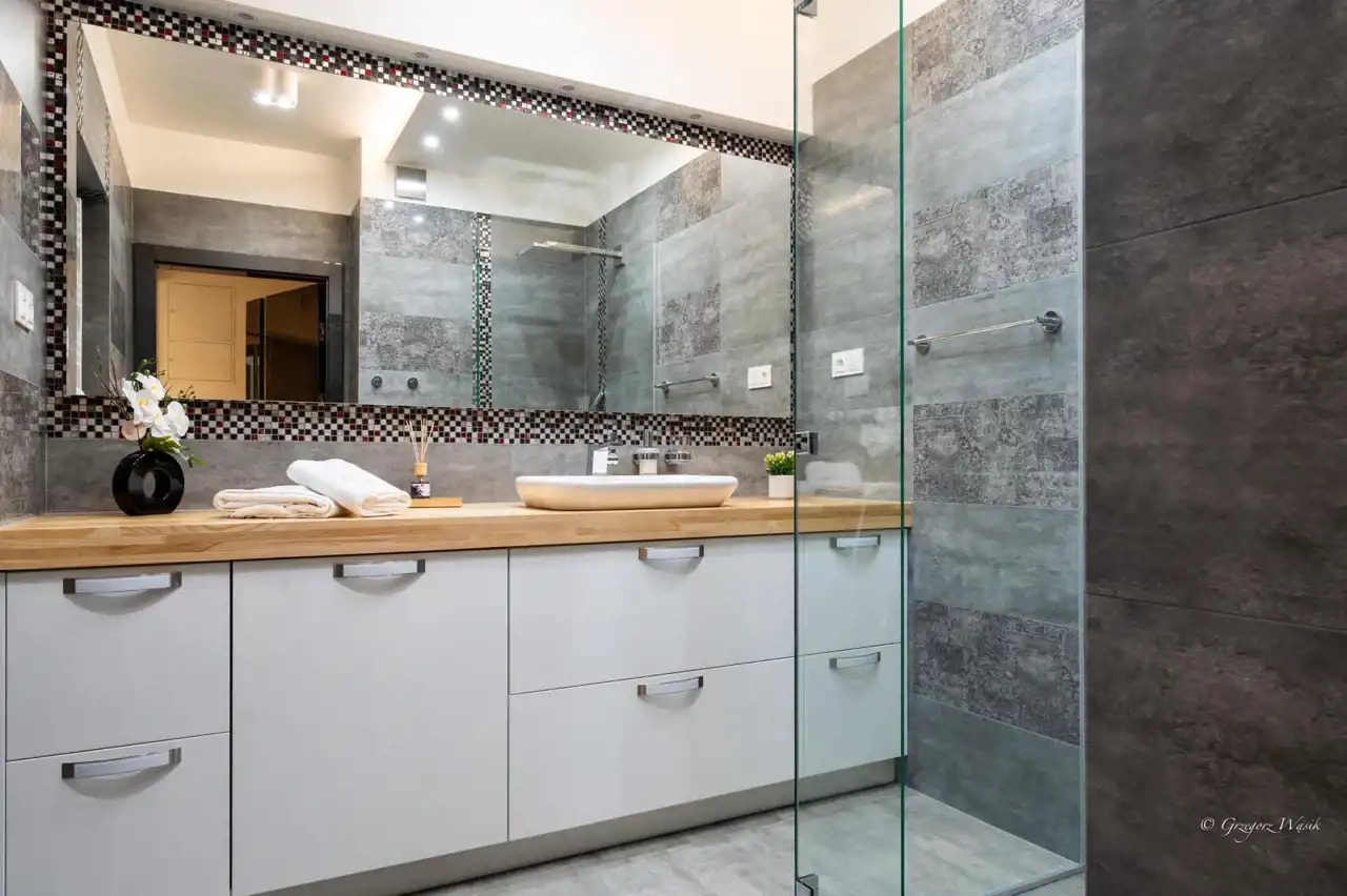 Salon kąpielowy: Prysznic z deszczownicą, prysznic walk in, podgrzewana podłoga i elegancka armatura – czysta przyjemność po dniu w górach.