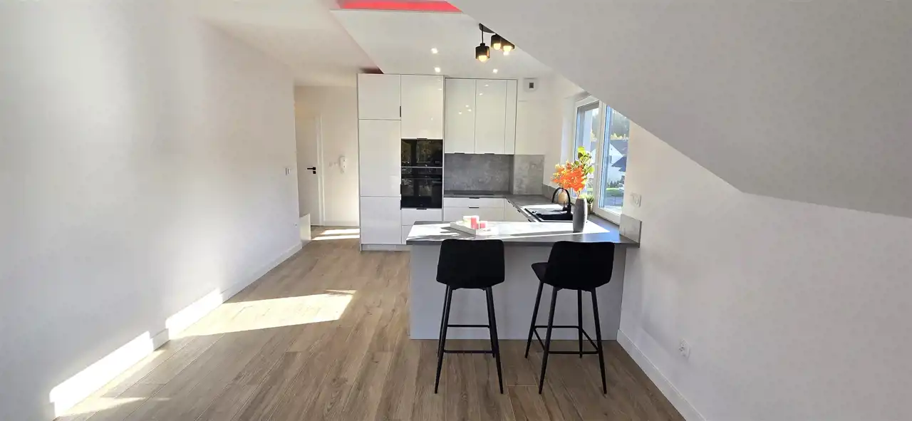 - salon z aneksem kuchennym i wyjściem na balkon,