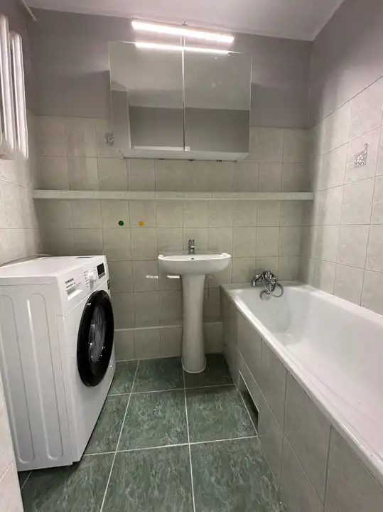 - łazienka z wanną i pralką