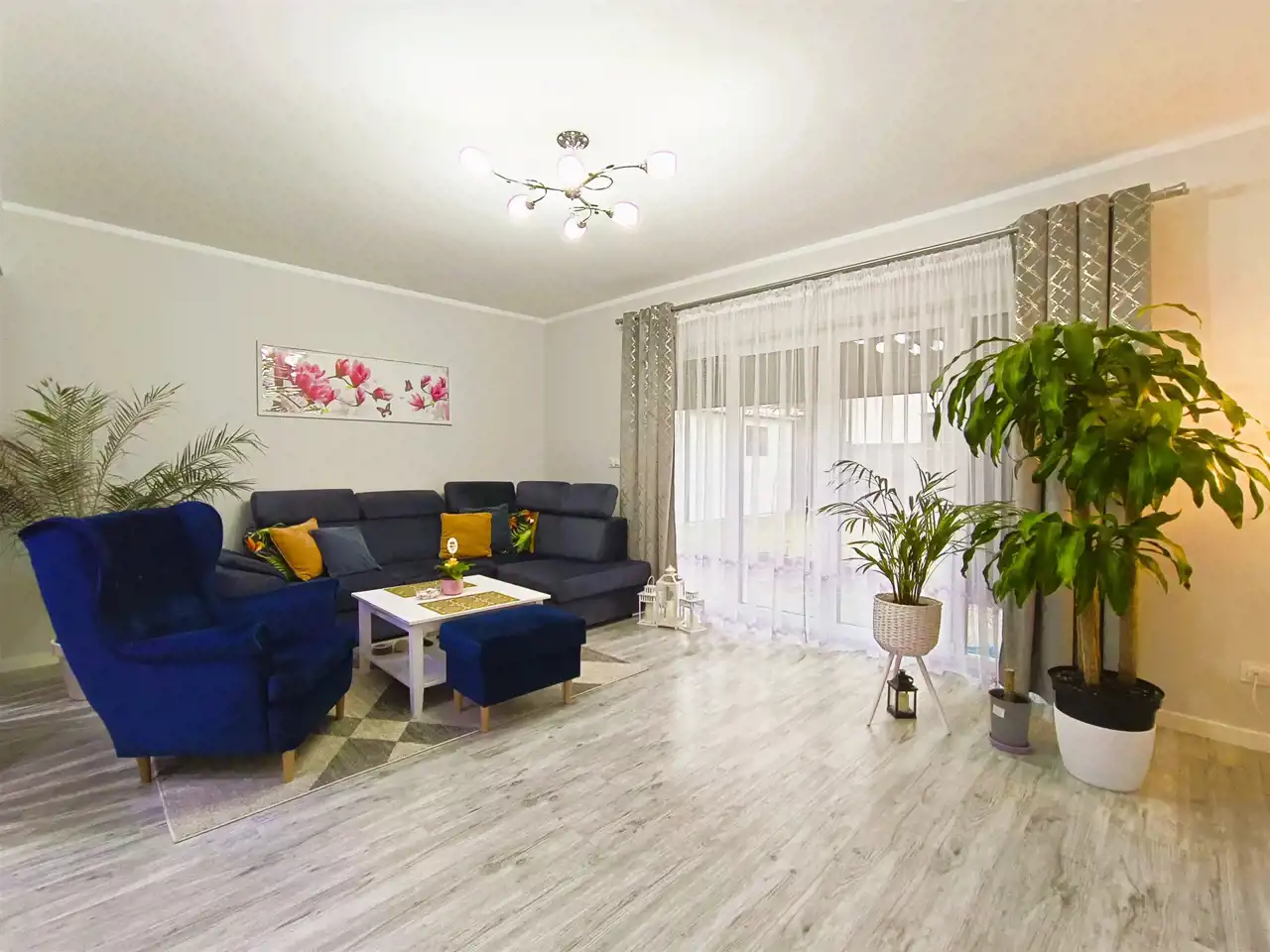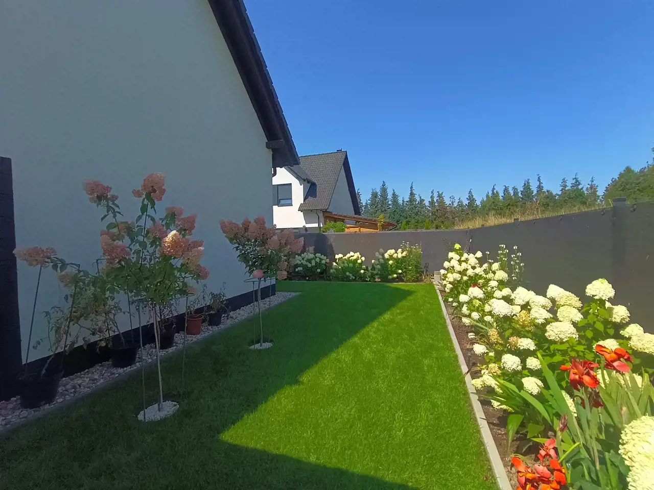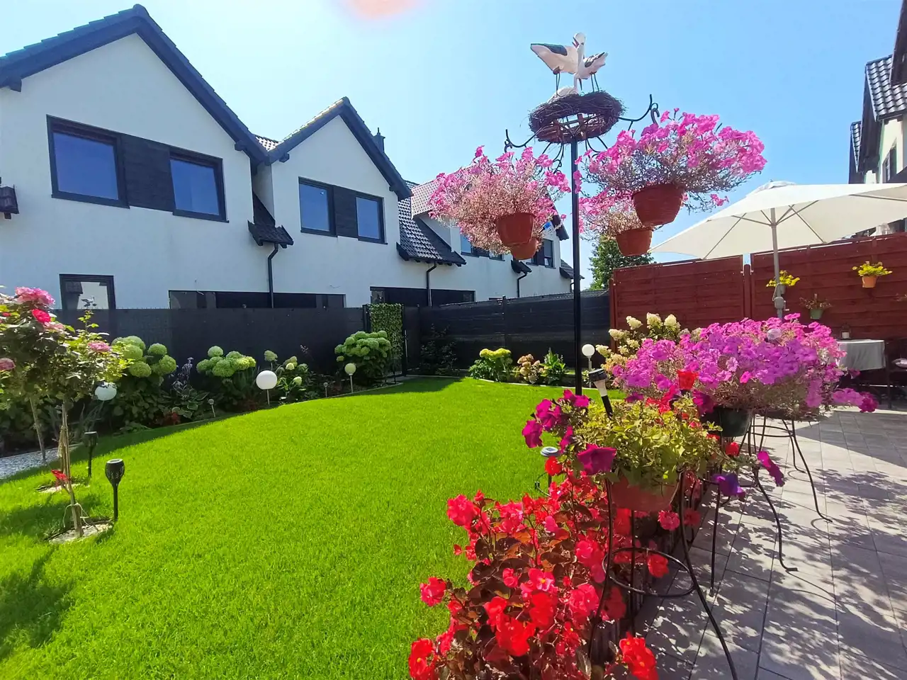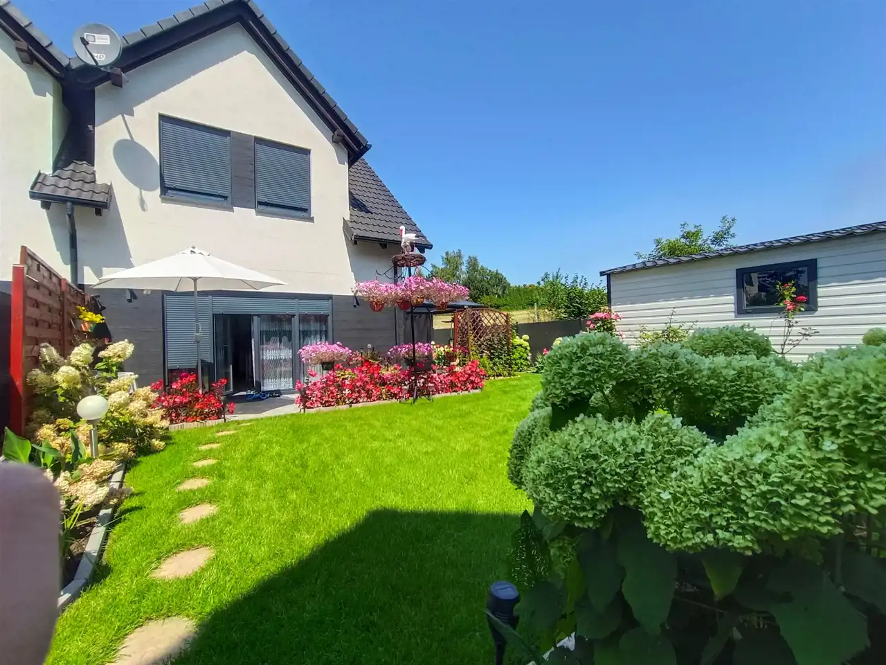 -Z salonu jest bezpośrednie wyjście na taras i przytulny, zadbany ogród, gdzie możemy wygodnie spędzać czas z rodziną i przyjaciółmi. W ogrodzie znajduje się również domek do przechowywania np. narzędzi czy zabawek ogrodowych, oraz duża pergola ogrodowa, wraz z meblami ogrodowymi, która chroni przed słoniem lub deszczem.