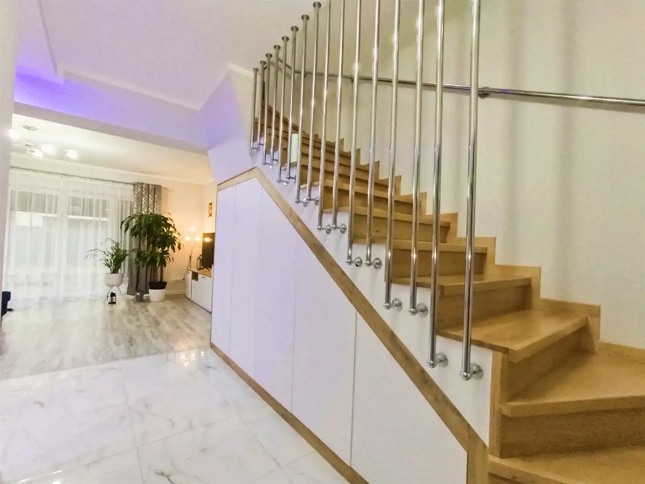 -schody prowadzące na piętro z wysokiej jakości materiałów, a pod nimi przestrzeń świetnie zagospodarowana dzięki szafom w zabudowie.