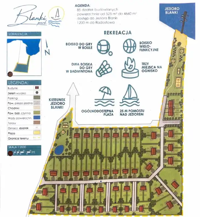 Na sprzedaż malowniczo położona działka rekreacyjna w miejscowości Radostowo, w gminie Jeziorany, nad jeziorem Blanki – jednym z największych i najczystszych jezior Warmii (powierzchnia ok. 440 ha).