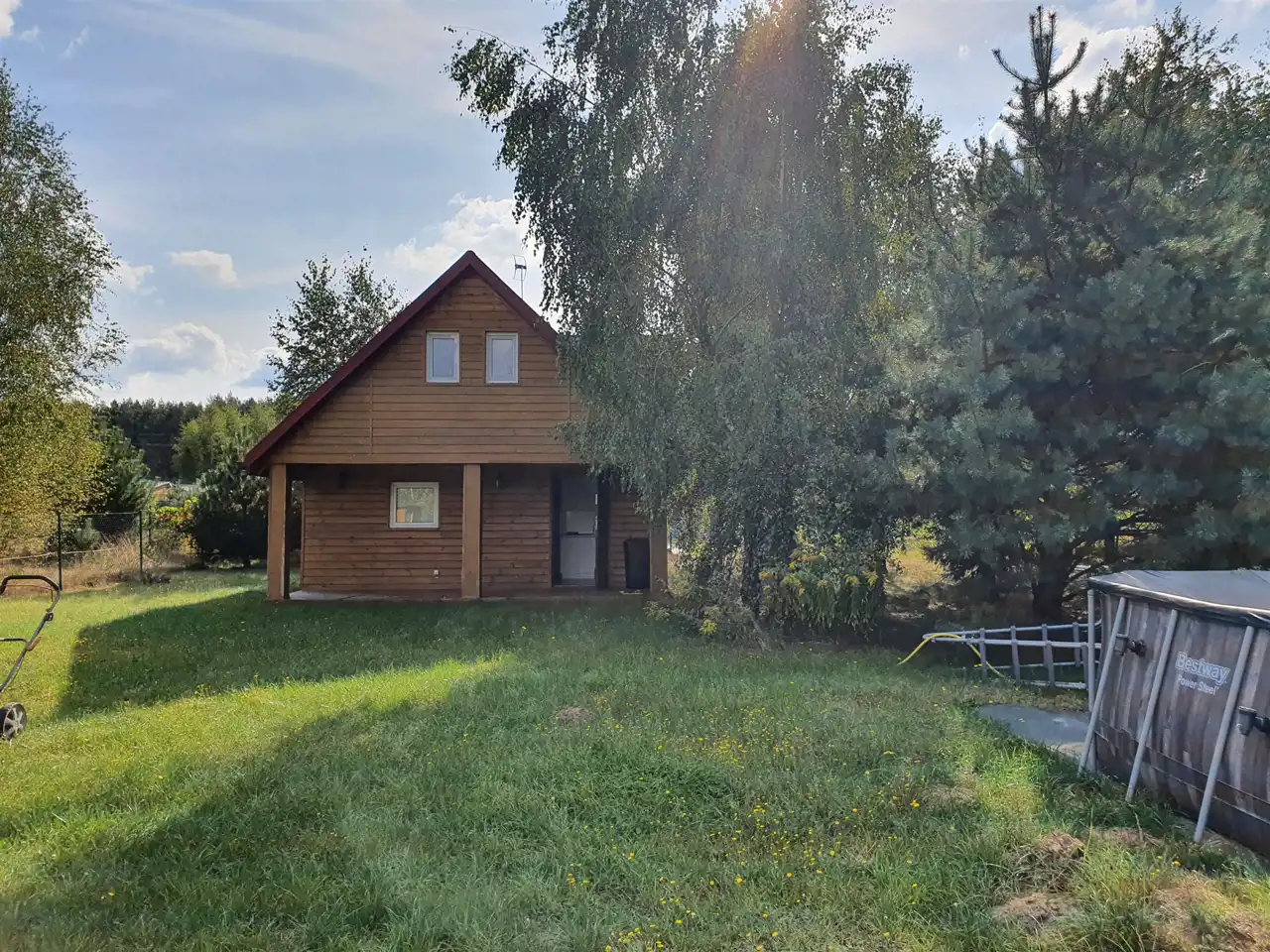 Do działki podłączony prąd, szambo (10 m³), podłączone dwie studnie. Teren działki ogrodzony, zagospodarowany, z wydzielonym miejscem na ognisko, niewielkim laskiem, sporym domkiem narzędziowym oraz dużym basenem sezonowym.