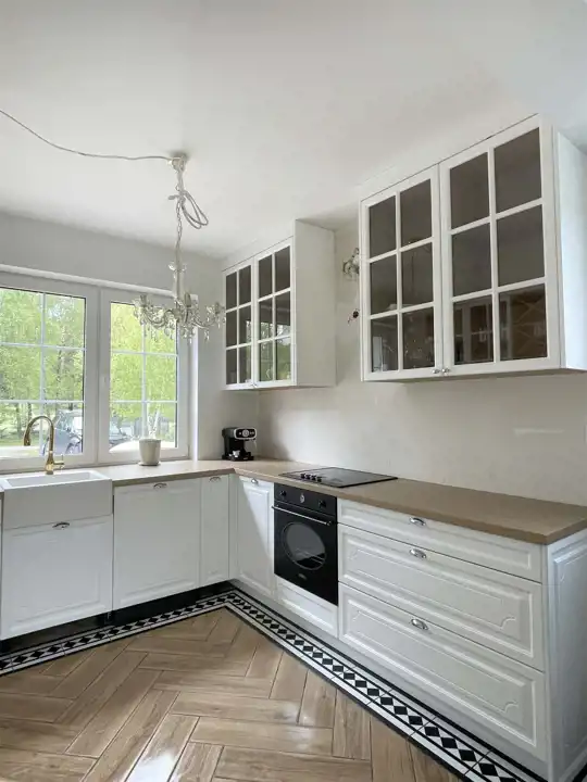 Meble kuchenne wykonane wg indywidualnego projektu pod wymiar przez renomowanego stolarza. Wszystkie sprzęty AGD są nowe. Na podłogach znajduje się gres szkliwiony.