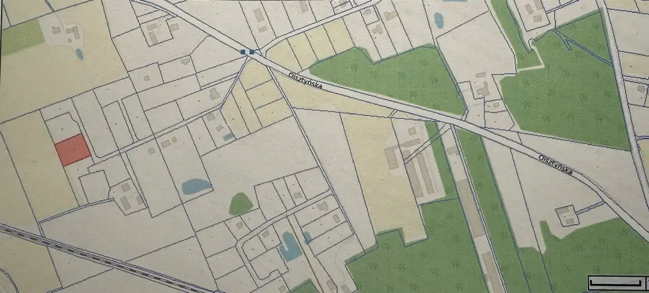 Działka płaska o kształcie regularnego prostokąta, częściowo zadrzewiona. Położona na skraju miejscowości w sąsiedztwie nowo wybudowanych domów na tworzącym się osiedlu. Odległość do ulicy Olsztyńskiej (asfalt) to 406m drogi gruntowej utwardzonej (ostatnie kilkadziesiąt metrów to droga polna). Energia elektryczna doprowadzona jest do sąsiednich działek. Wodę (warstwa wodonośna na głębokości ok 20m) i oczyszczalnie aktualnie należy zapewnić we własnym zakresie. Walorem działki jest cisza, czyste powietrze, nieodległy duży kompleks leśny, ładne widoki. Do centrum miejscowości gminnej z bogatą ofertą handlowo- usługową, oświatową, kościołem itp,- 2 km; do centrum Olsztyna- 12 km. W odległości 406m, przy ulicy Olsztyńskiej, znajduje się przystanek autobusowy.