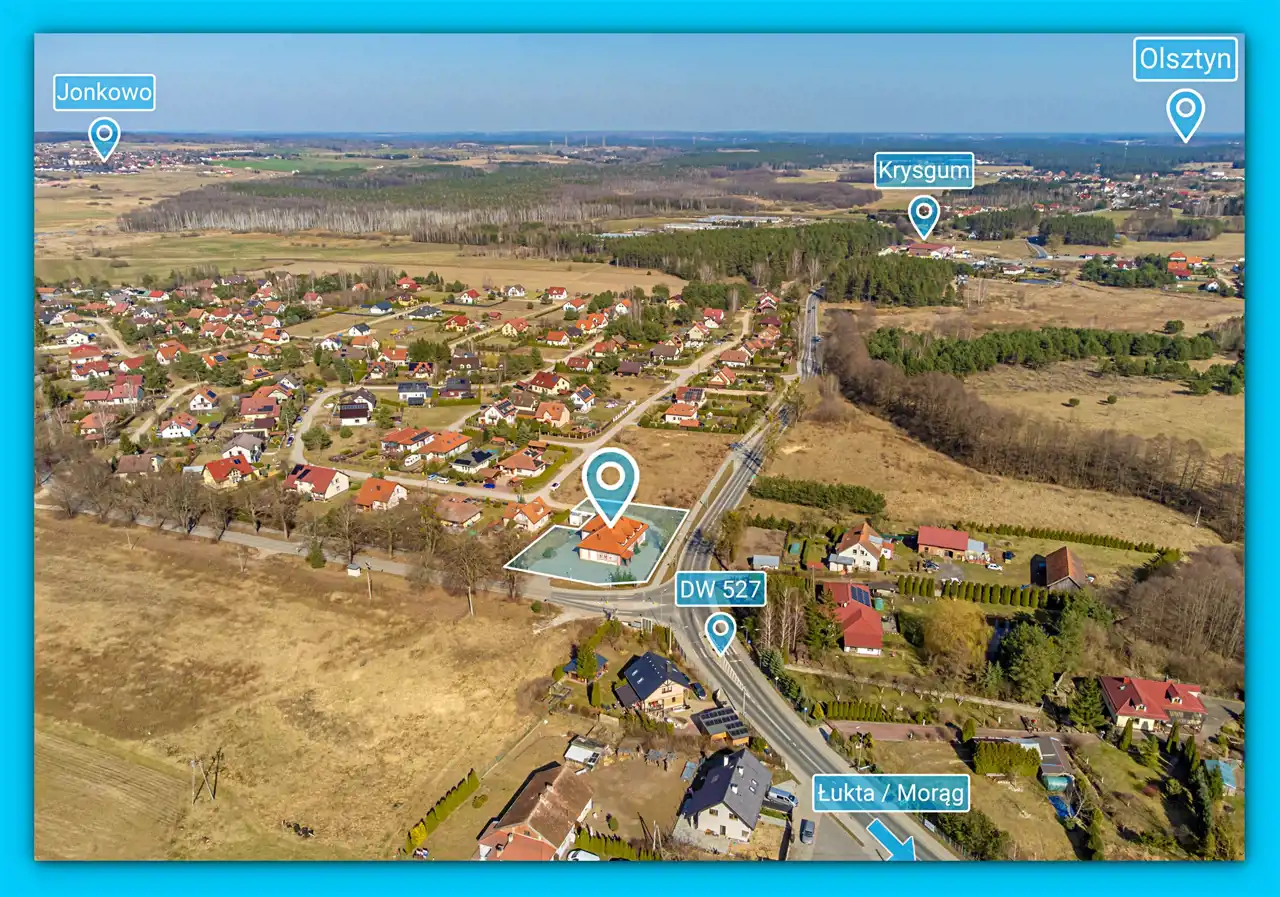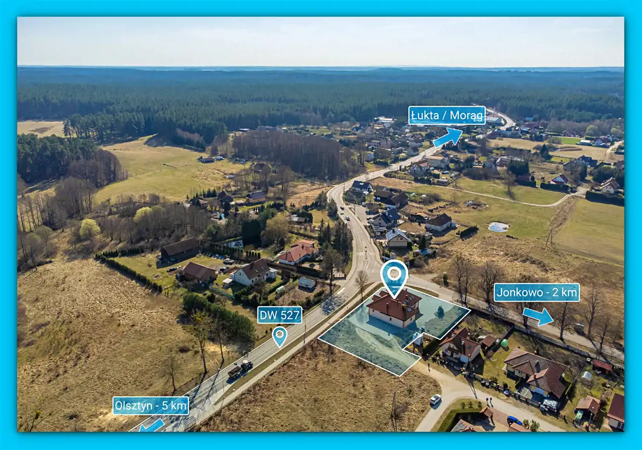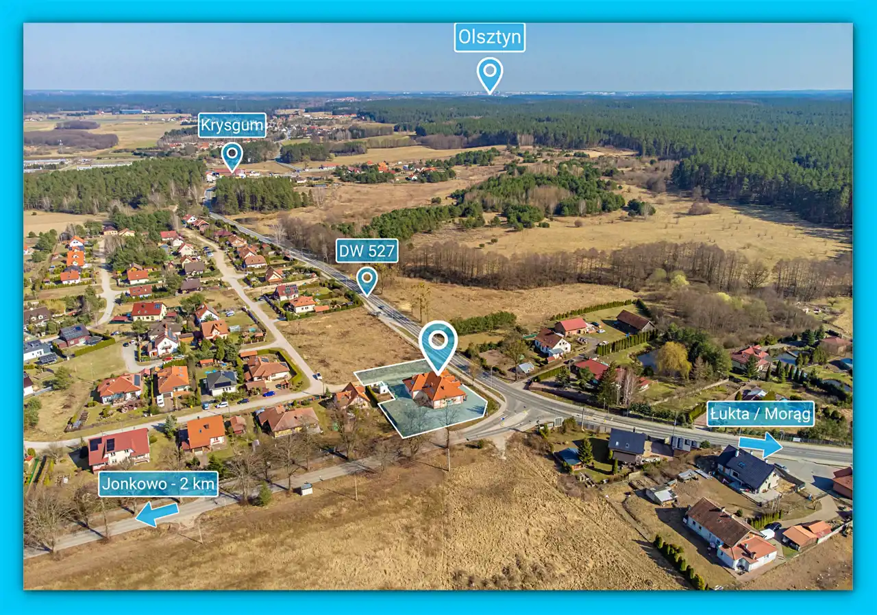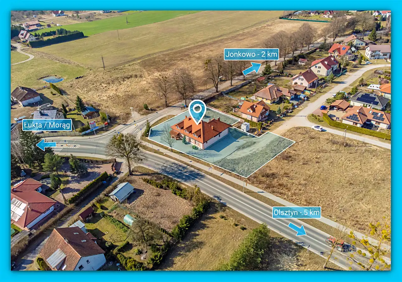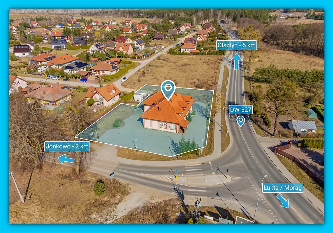 Nieruchomość położona jest w odległości ok. 6 km od osiedla Olsztyn Gutkowo oraz ok. 3 km od miejscowości Jonkowo, usytuowana jest u zbiegu drogi wojewódzkiej nr 527 (Olsztyn - Giedajty - Pasłęk) oraz drogi powiatowej (Jonkowo – Giedajty). W najbliższym sąsiedztwie nieruchomości dominuje głównie zabudowa mieszkaniowa jednorodzinna. W odległości 60 m od posesji znajduje się przystanek autobusowy, w odległości niespełna 100 m Piekarnia Tyrolska. Nieruchomość posiada bezpośredni dostęp do drogi publicznej - wjazd na posesję bezpośrednio z drogi powiatowej.