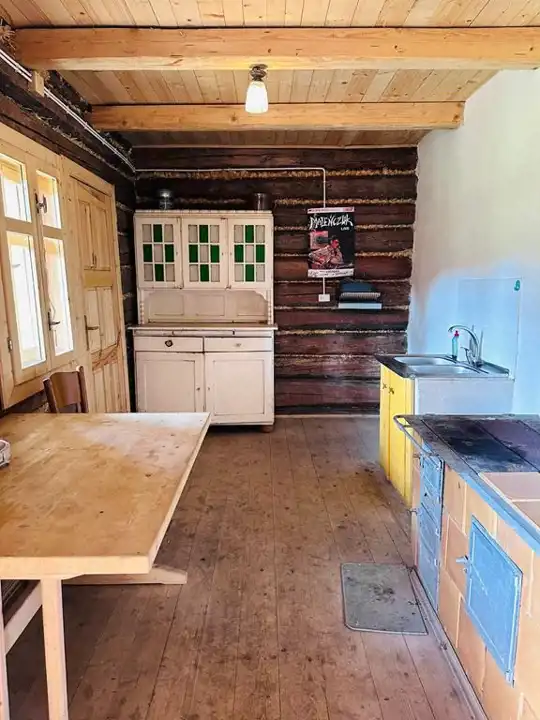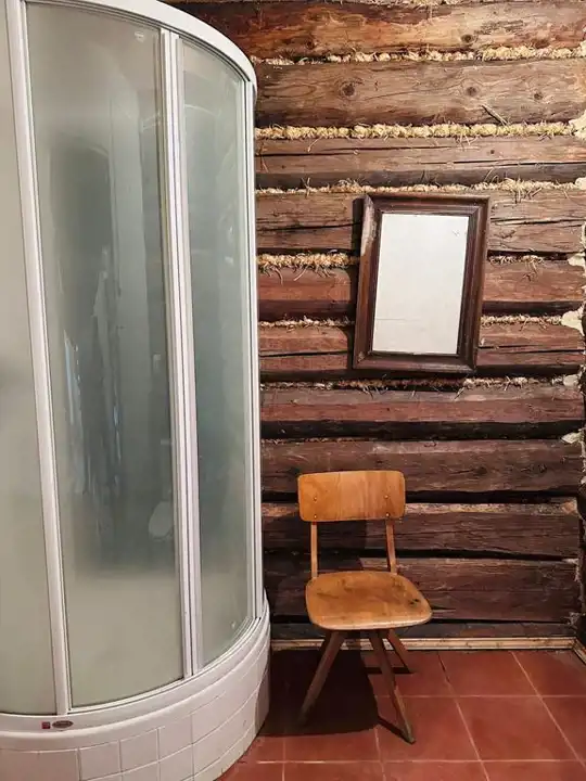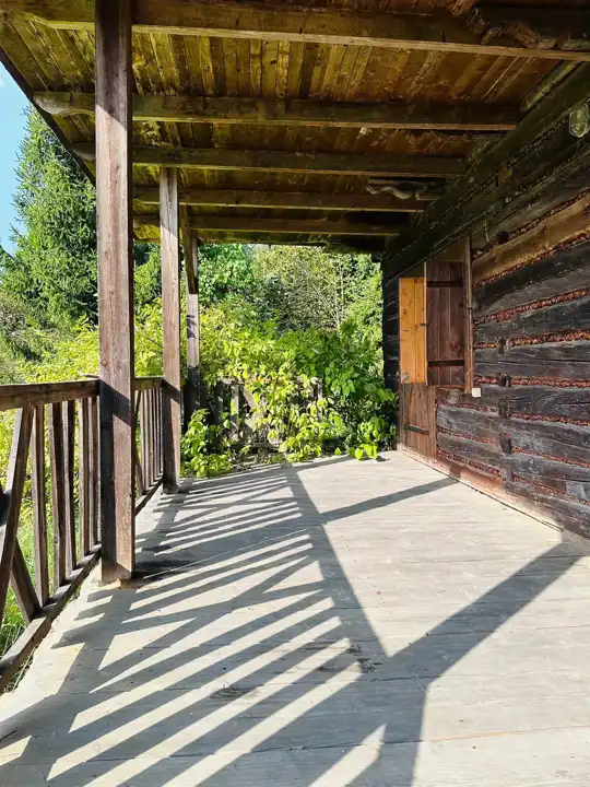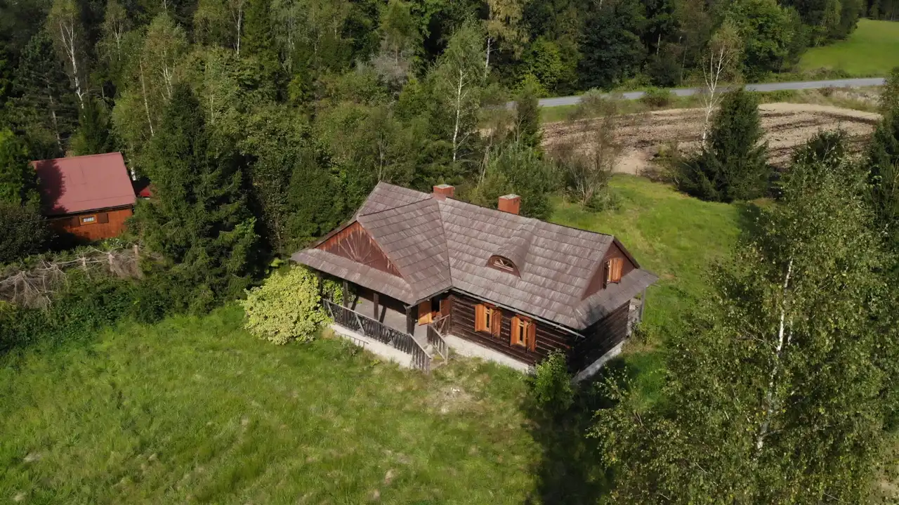 Budynek przeniesiony (posiada wszelkie potrzebne pozwolenia); bale zdrowe, częściowo wymienione na nowe. Fundamenty również nowe. Dach ocieplony wełną mineralną i pokryty gontem. Okna drewniane ze stylowymi okiennicami.