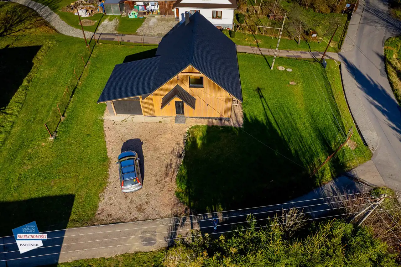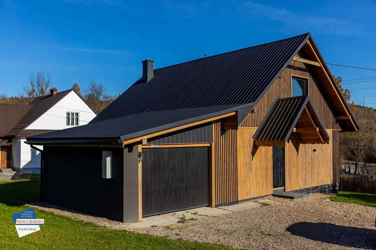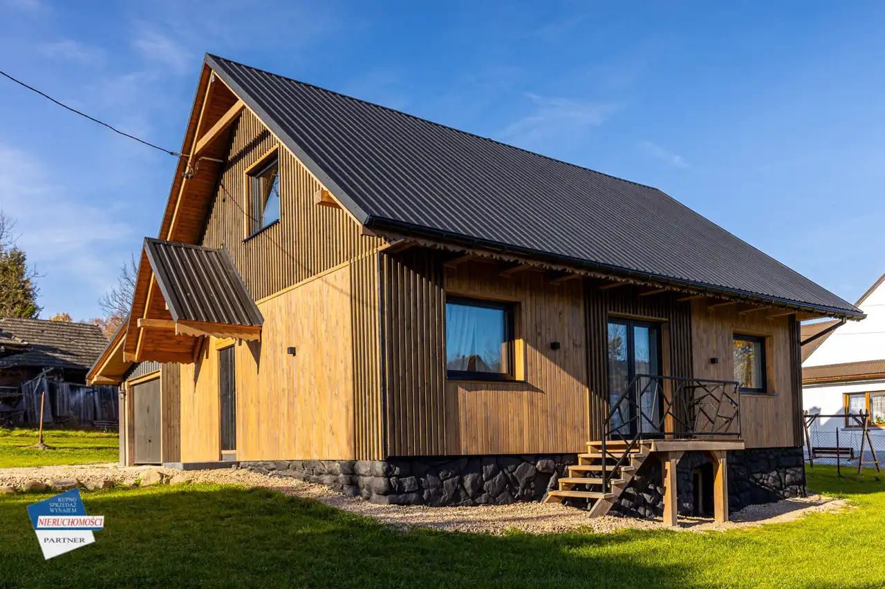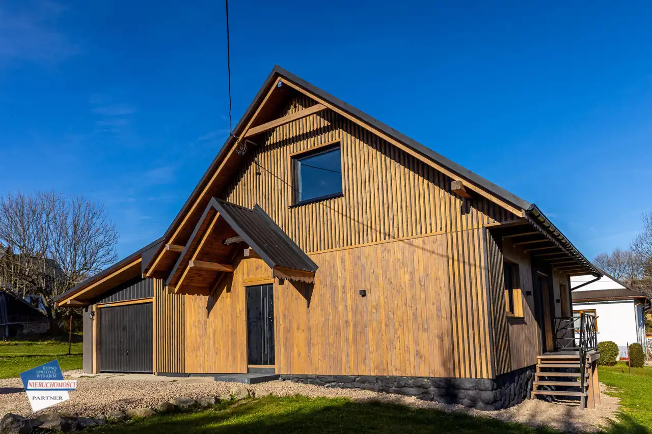 Dom wybudowany w technologii szkieletowej ocieplony wełną mineralną o grubości 20 centymetrów. Charakteryzuje się ciekawą, a zarazem prostą i elegancką architekturę , co z jednej strony uzyskano poprzez zastosowanie systemu lamelowej elewacji, zestawieniem różnych kolorów czerni i brązu z zachowaniem rysunku drewna. Drewniana elewacja w połączeniu z kamienną podmurówką oraz grafitowymi oknami daje znakomity efekt. Na uwagę zasługują również belki podsufitowe na parterze w naturalnym kolorze oraz niewielką kamienną piwniczkę ze sklepieniem.
