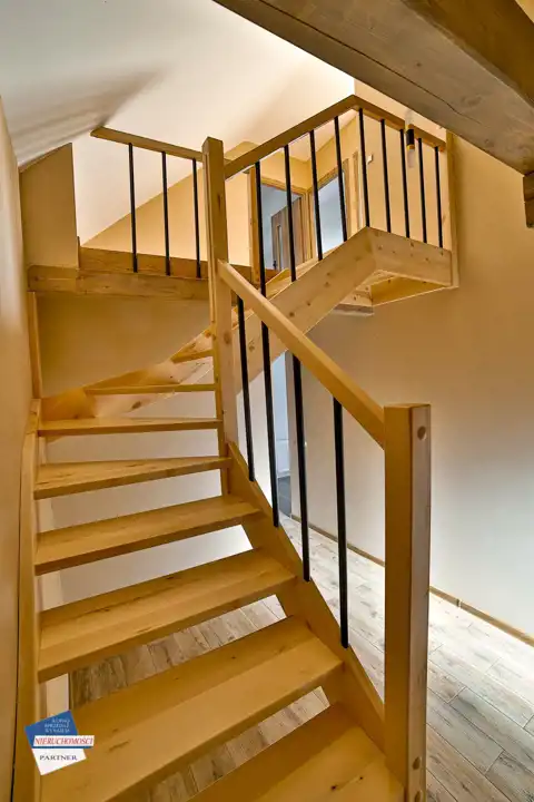 parter: pokój dzienny z aneksem kuchennym, łazienka z wc, klatka schodowa, korytarz, kotłownia