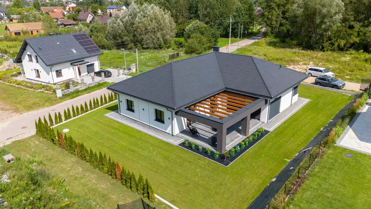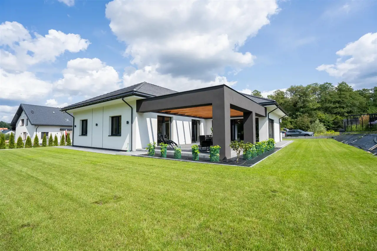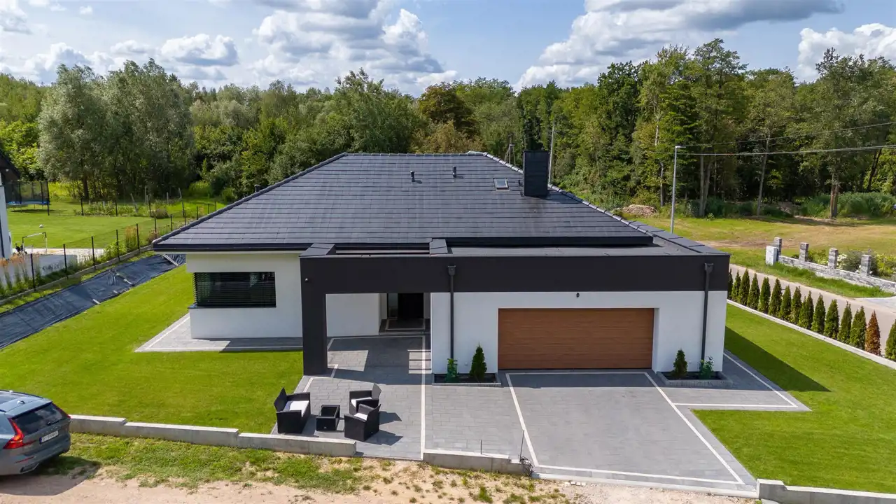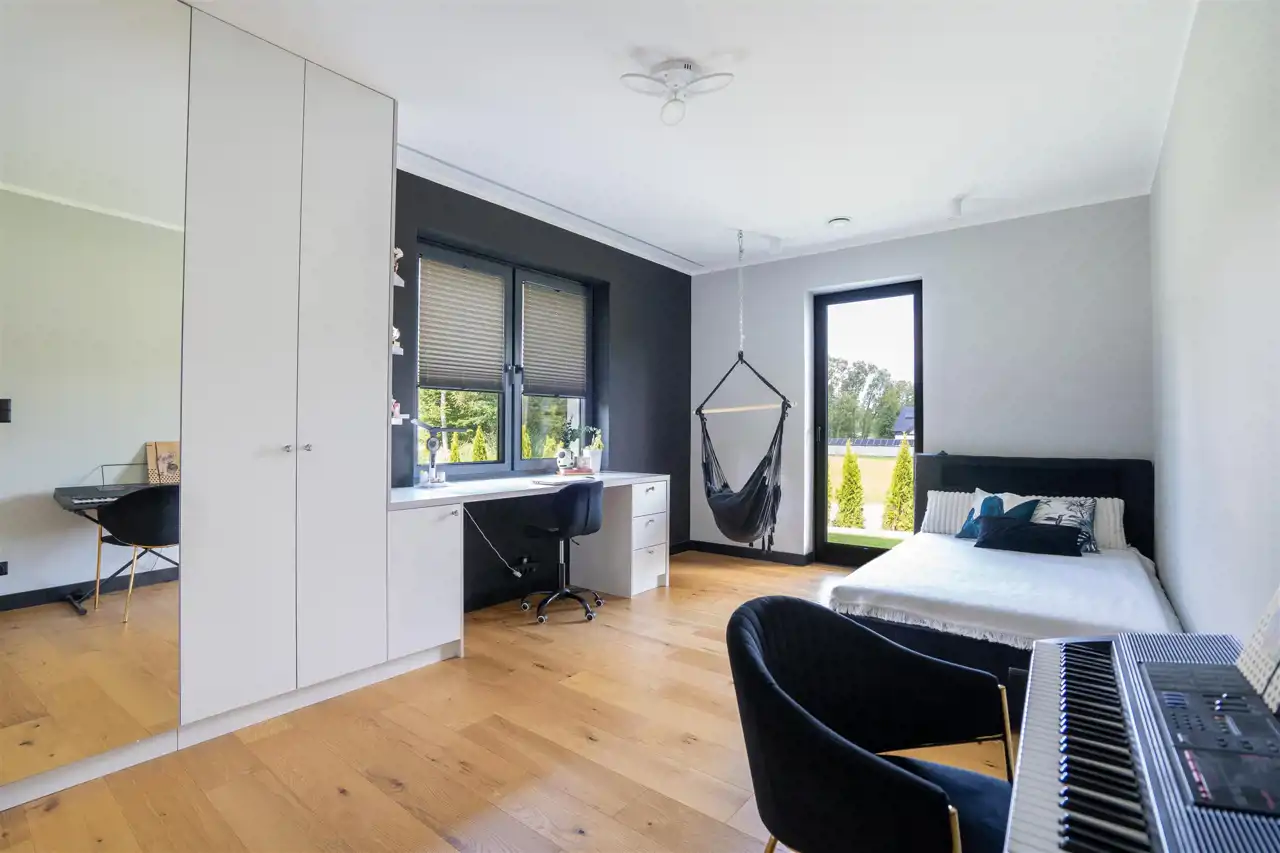 Projekt wnętrz ujmuje spójną, stonowaną kolorystyką oraz jakością wykończenia. Na podłodze w salonie i sypialniach naturalny dąb z systemem ogrzewania podłogowego. Okna aluminiowe + PCV- 3-szybowe z ciepłym montażem. W kotłowni znajduje się gruntowa pompa ciepła marki Viessmann, która zapewnia niski pobór prądu. Dodatkowym atutem jest klimatyzacja, która schłodzi przestrzeń w upalne dni. Dom jest docieplony styropianem o grubości 20 cm, dach pokryty dachówką betonową.