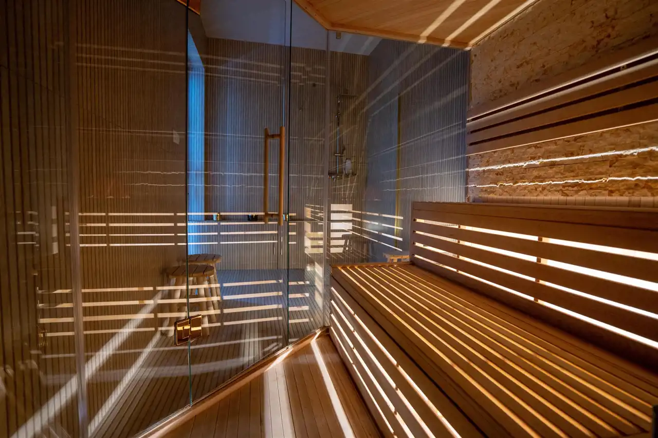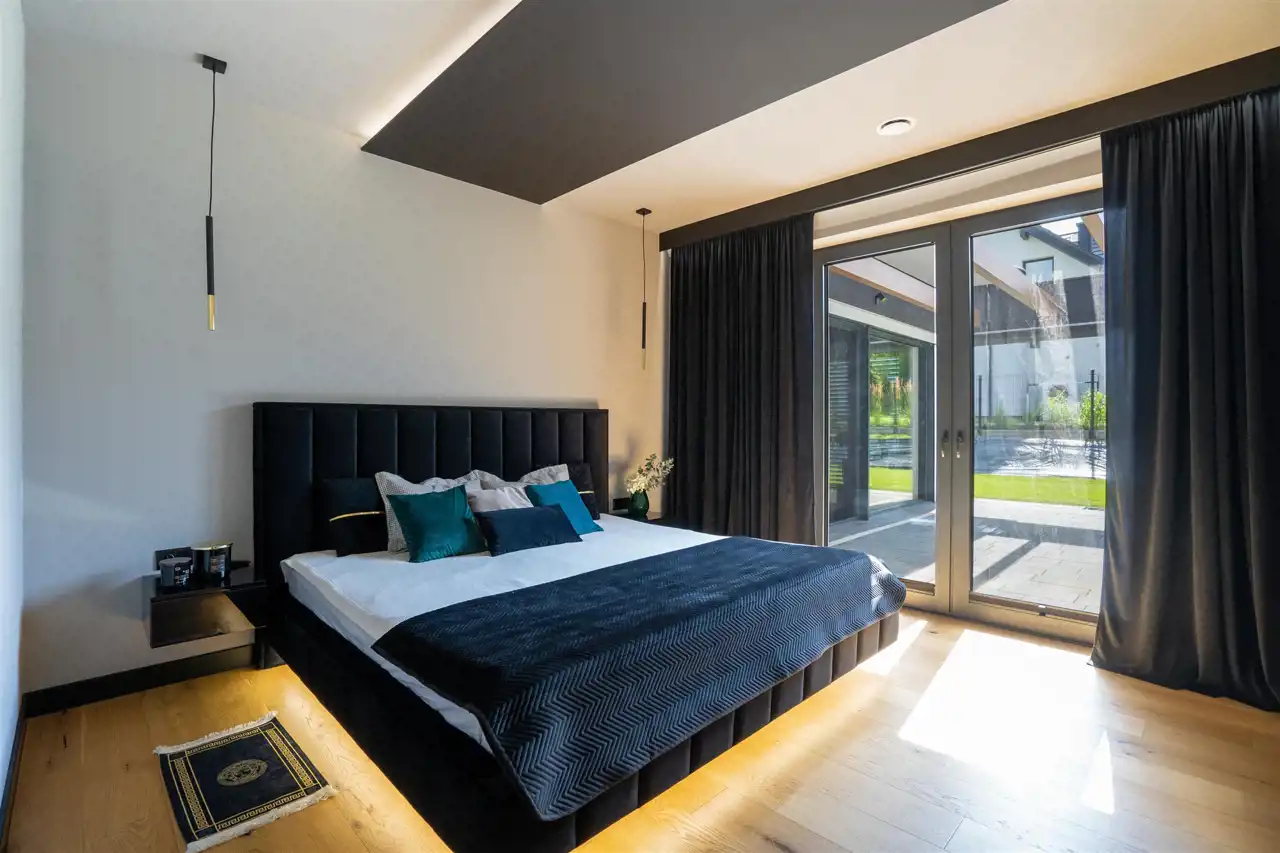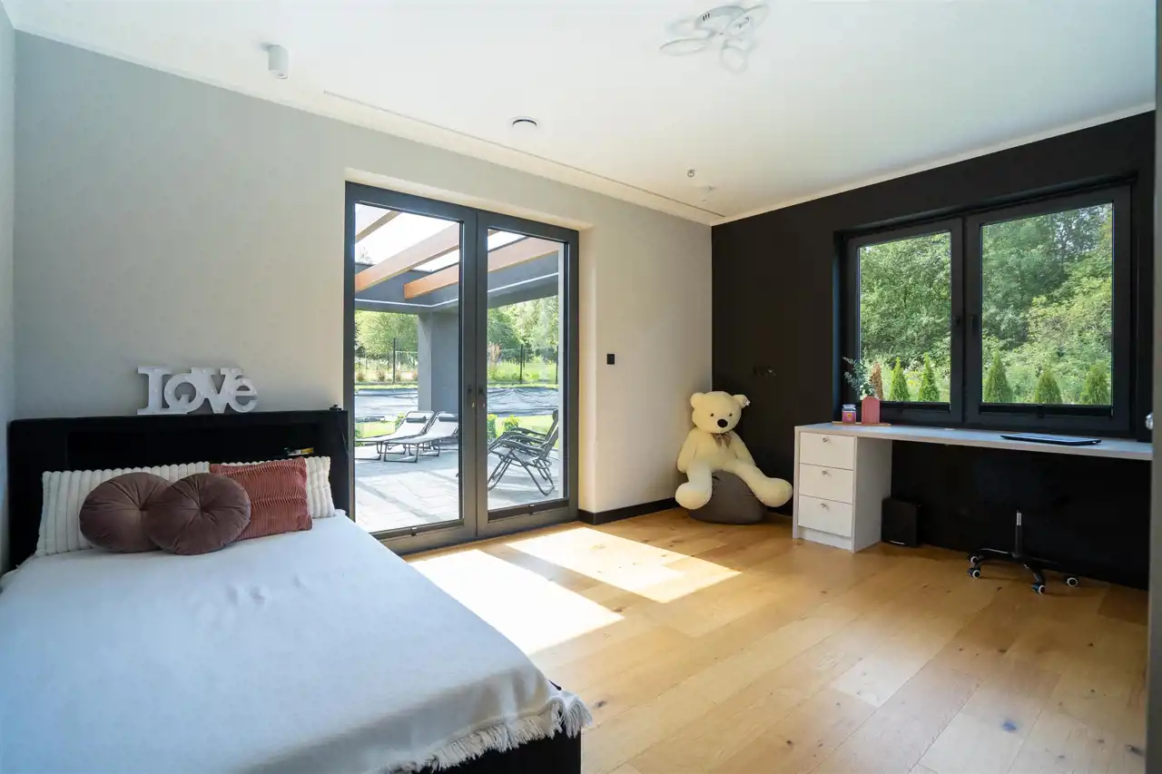 Strefa prywatna obejmuje 3 przestronne sypialnie, gabinet z prywatną łazienką, garderobę oraz łazienkę z wanną wolnostojącą i prysznicem. Dzięki temu przestrzeń do wypoczynku jest uporządkowana, a wszystkie prywatne rzeczy możemy ulokować w garderobie i łazience. Każda sypialnia ma możliwość wyjścia na taras lub zieleń. Pozostałe pomieszczenia to wiatrołap, kotłownia oraz sauna z prysznicem z możliwością wyjścia na ogród. Dla fanów motoryzacji nieruchomość posiada dwustanowiskowy garaż w bryle (51,72 m2). Bezpieczeństwo zapewniają żaluzje zewnętrzne w całym domu oraz monitoring.