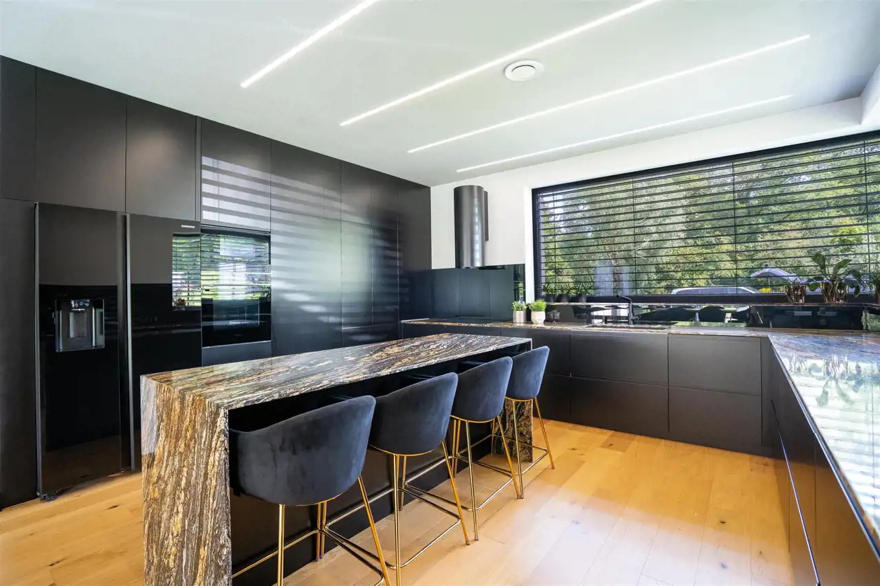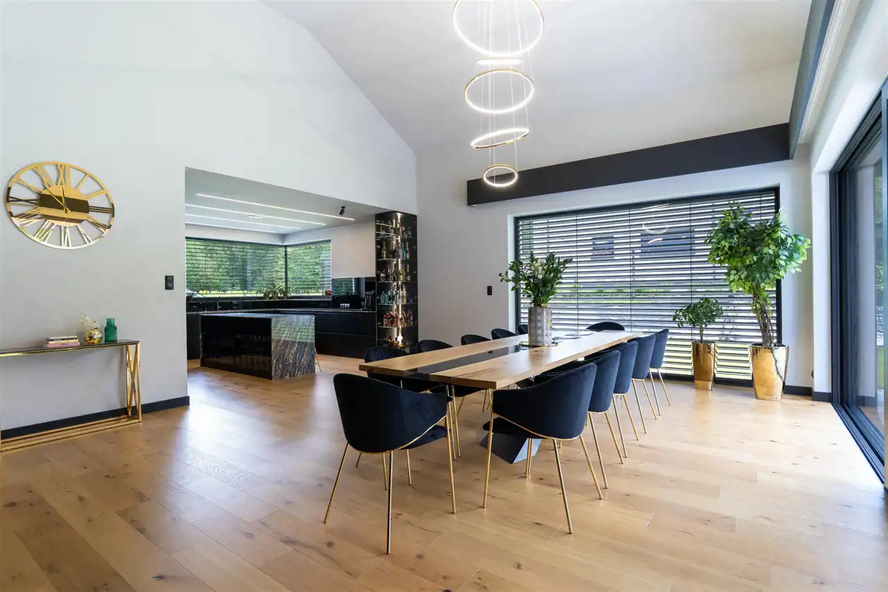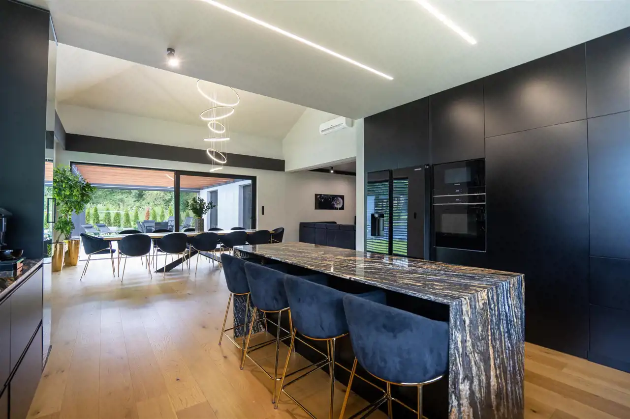 Centralnym punktem domu jest otwarty pokój dzienny, który wraz z kuchnią i jadalnią tworzy nowoczesne wnętrze. Na uwagę zasługuje duża, ergonomicznie urządzona kuchnia, wyposażona w profesjonalny sprzęt tj. piekarnik, mikrofalówka, zmywarka, lodówka Side by Side. Zdecydowanie miejsce dla tych, którzy lubią gotować! Praktycznym rozwiązanie jest zamykana spiżarnia z blatem roboczym wkomponowana w zabudowę kuchni.