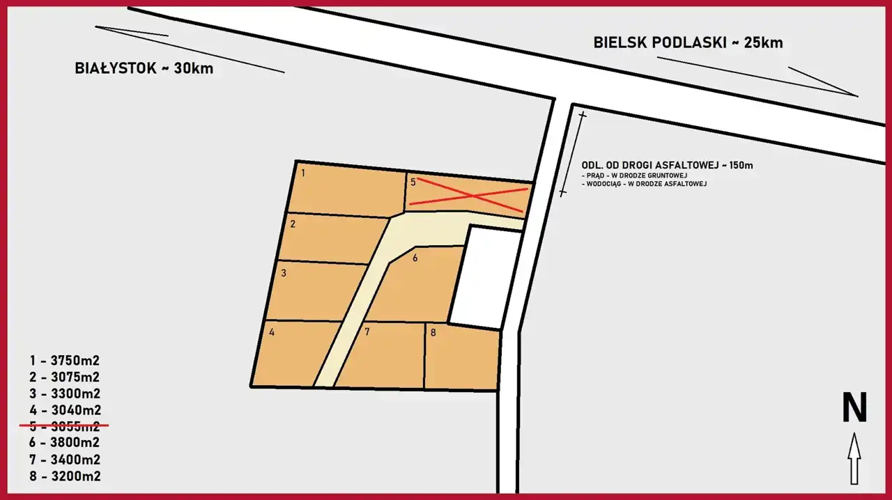 W sprzedaży dostępnych jest siedem działek o powierzchniach od ok. 3000m2 do ok. 3700m2 w cenie 50zł/m2.