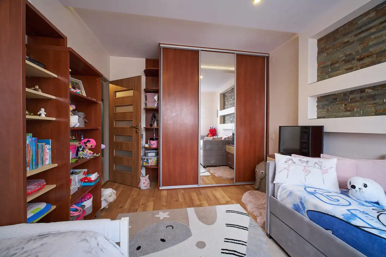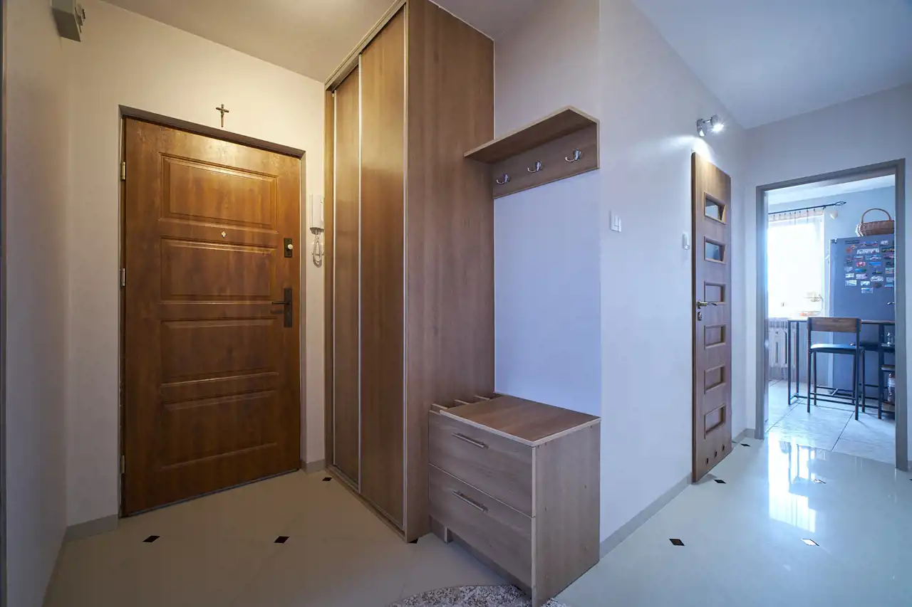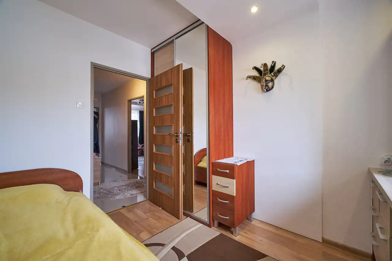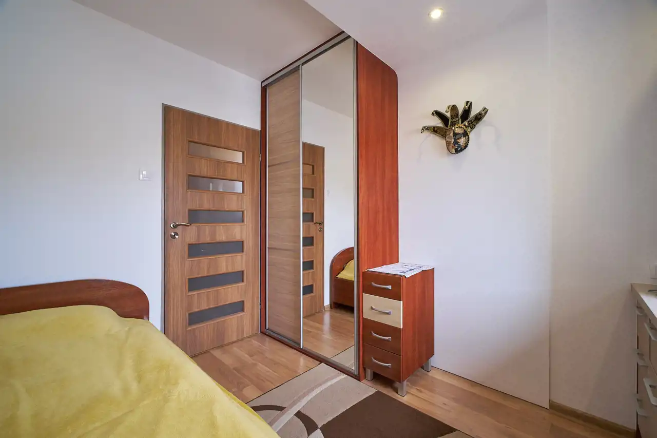 Mieszkanie o powierzchni 56,02 m2 składające się z 3 oddzielnych pokoi, oddzielnej kuchni oraz łazienki z WC. Układ pomieszczeń jest dwustronny. Wnętrze lokalu jest jasne, zadbane i urządzone w tym wyposażone w stałe zabudowy.