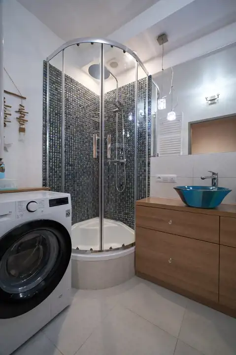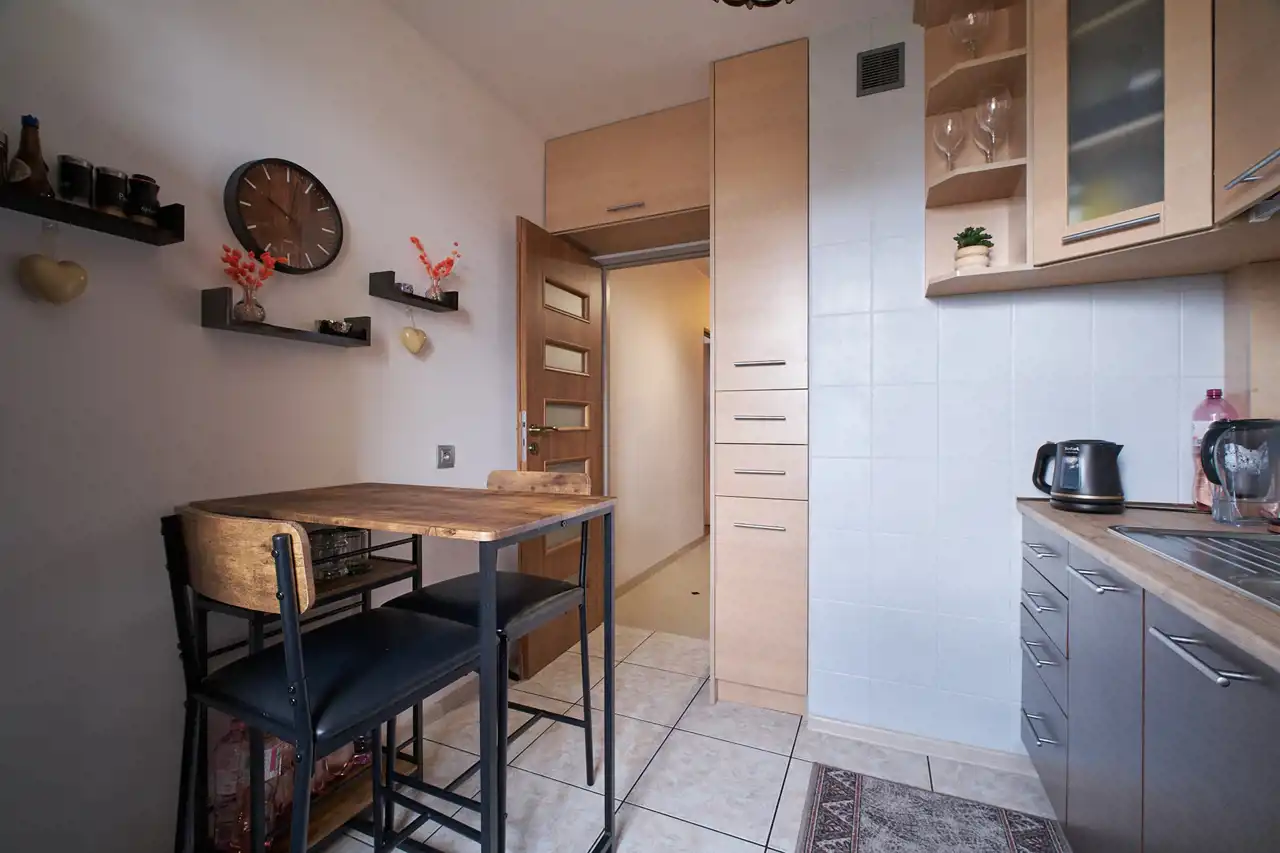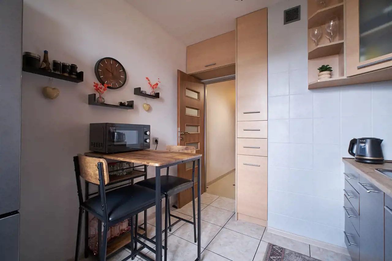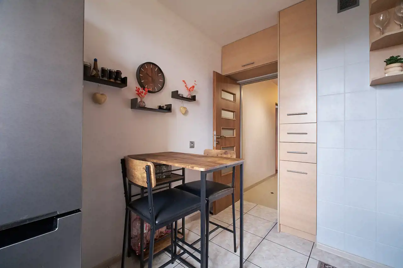 Oddzielna kuchnia wyposażona w funkcjonale szafki może stanowić dodatkowy atut dla wielu klientów. Łazienka razem z WC wyposażona w kabiną prysznicową.