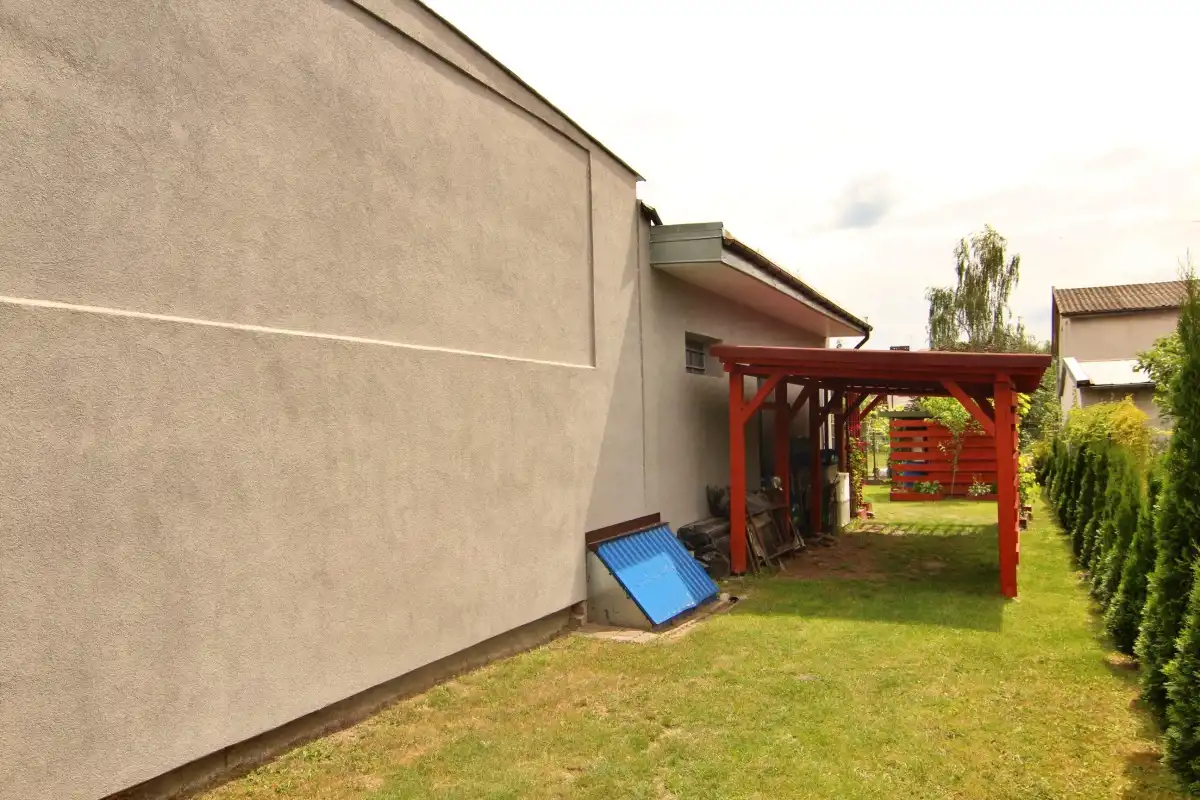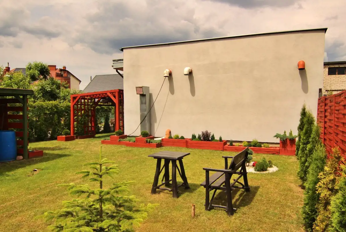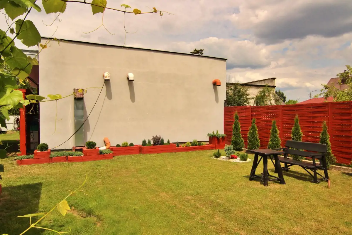 Działka ogrodzona jest jest metalowym ogrodzeniem. Przed jednym z wjazdów do garażu została wybudowana metalowa wiata pozwalająca na wykonywanie niektórych prac na zewnątrz budynku, niezależnie od warunków pogodowych.