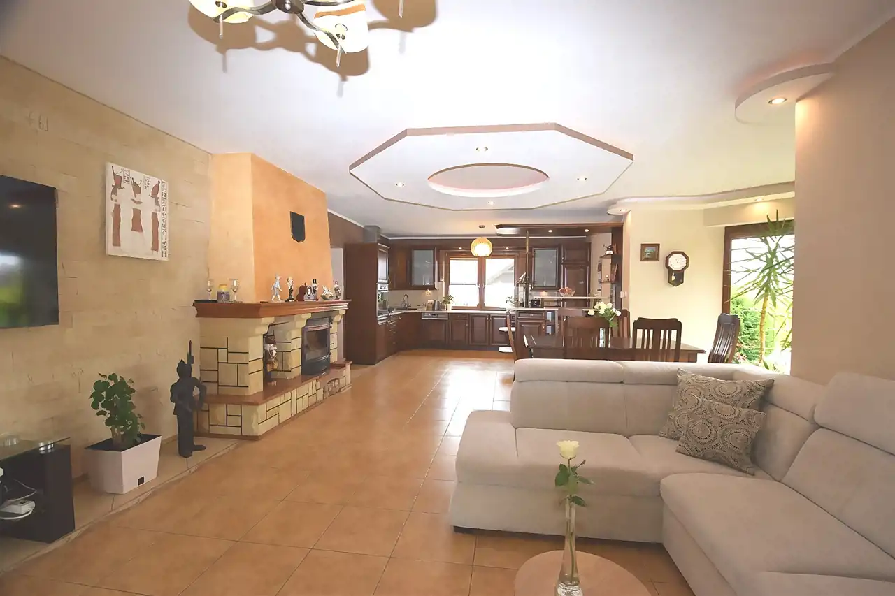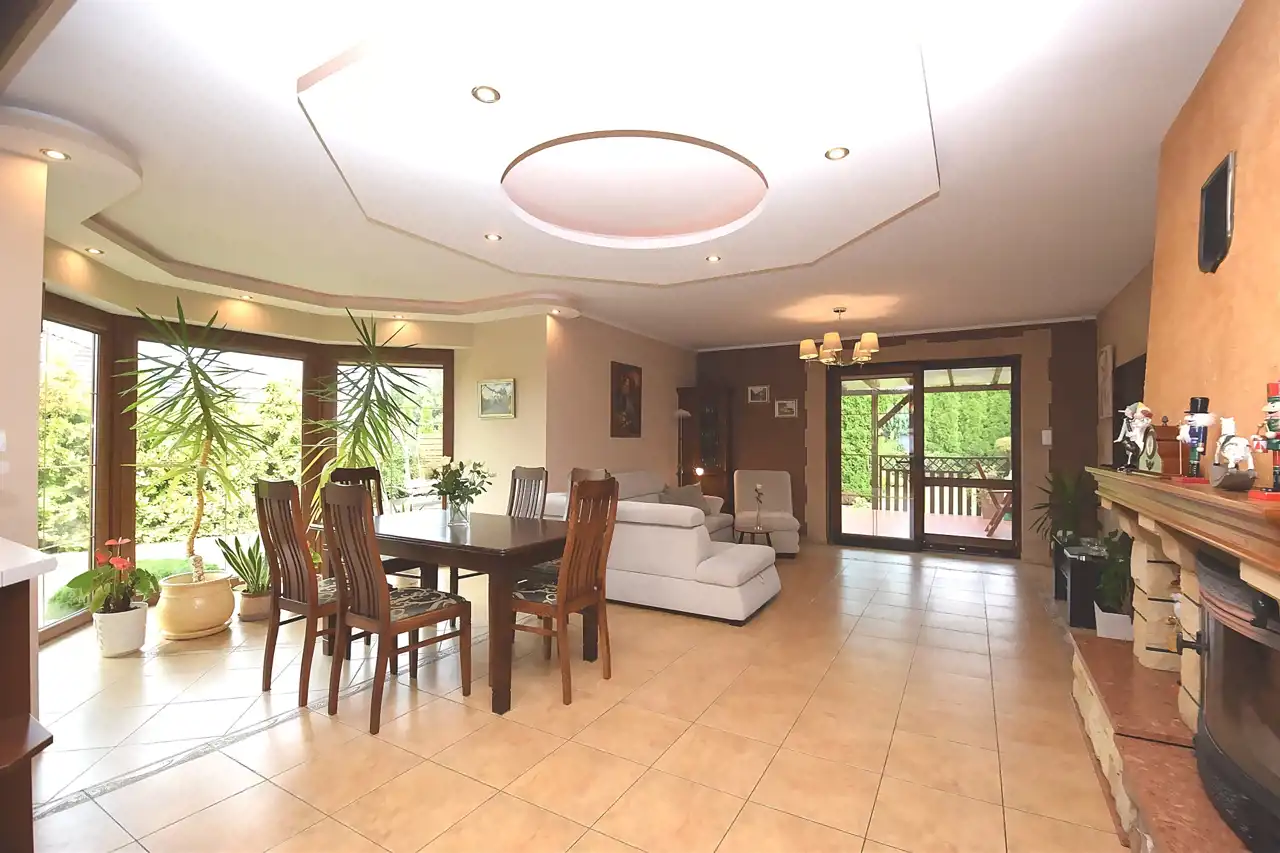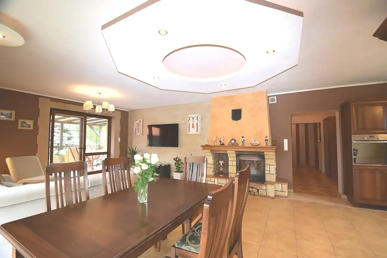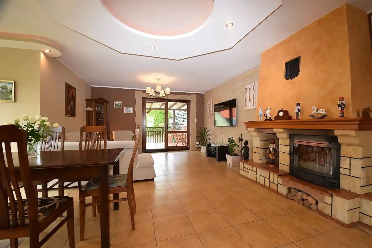 - Przytulny salon z kominkiem połączony z jadalnią o łącznej pow. ok. 45 m2, z której roztacza się piękny widok na ogród i wyjście na taras - idealne miejsce na relaks i wspólne spędzanie czasu z rodziną i przyjaciółmi. Kominek z płaszczem wodnym