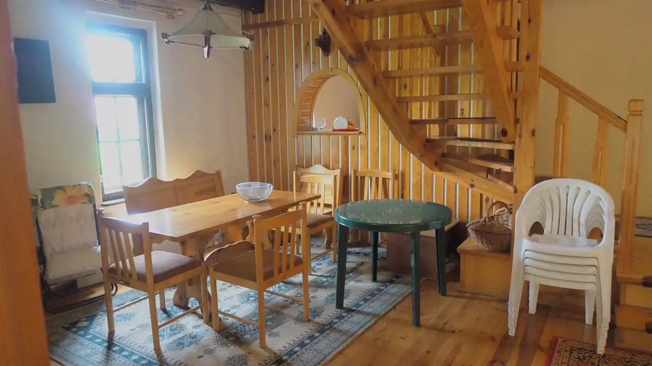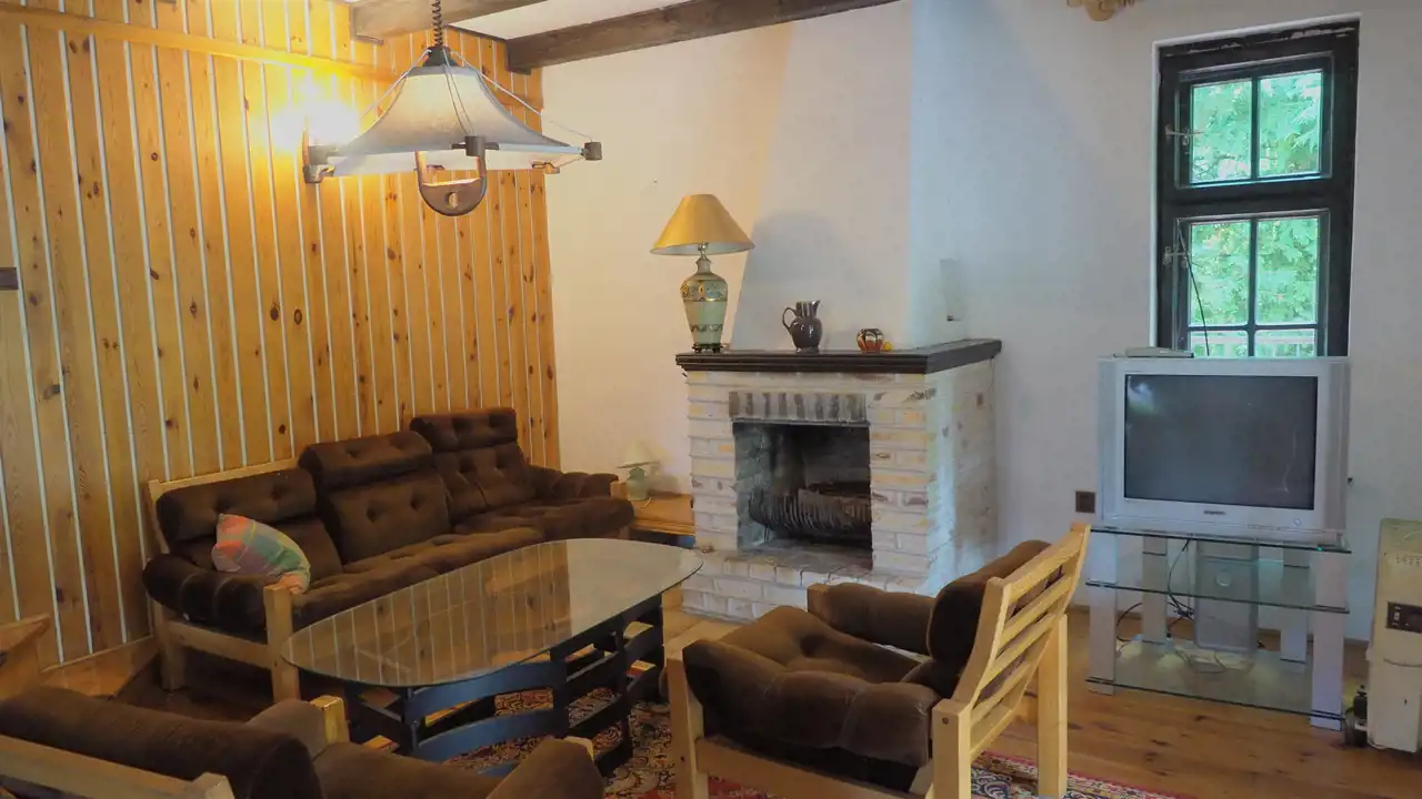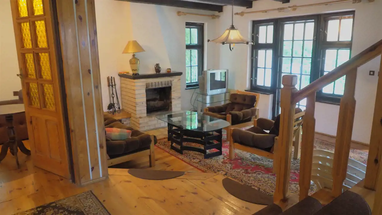 - PARTER - salon z kominkiem o pow. 38 m 2, kuchnia o pow. 7,7m2, pokój o pow. 7,7 m2, łazienka o pow. 3,8 m2, , pomieszczenie gospodarcze-spiżarka o pow. 4 m2 oraz przedpokój o pow. 2,3 m 2