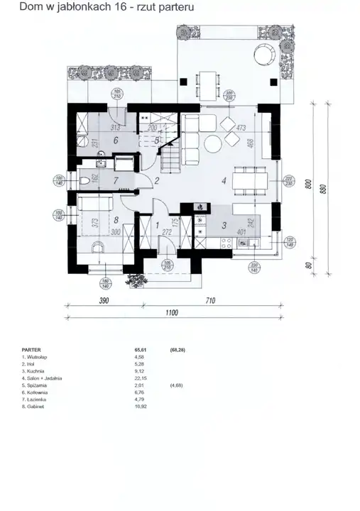 Tytułem oferty jest dom w stanie deweloperskim wybudowany wg projektu "DOM W JABŁONKACH 16" o następującym układzie pomieszczeń: