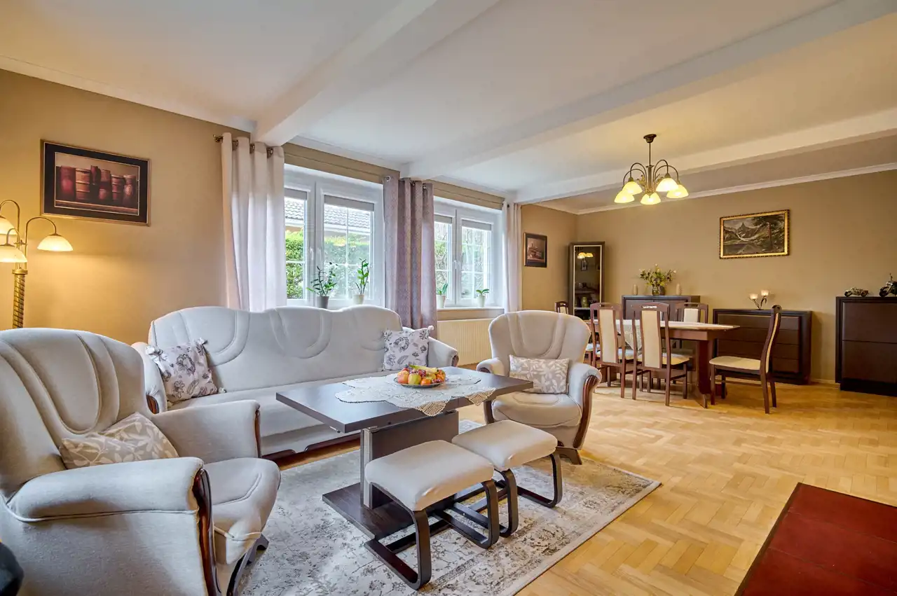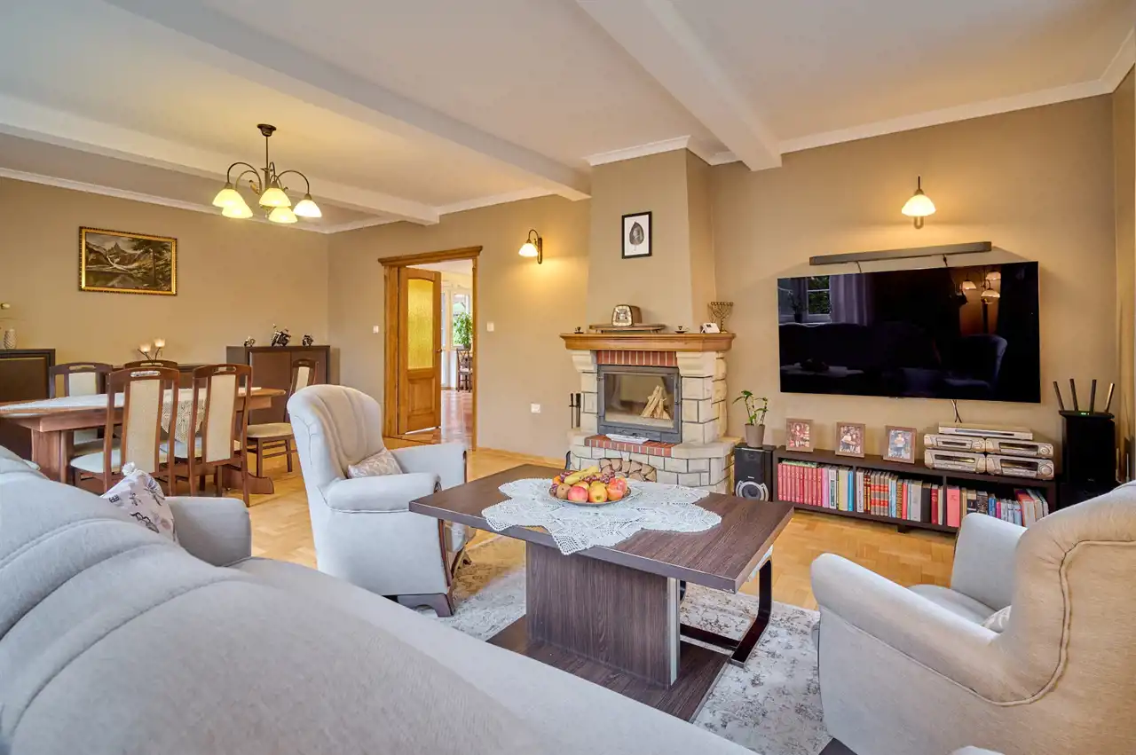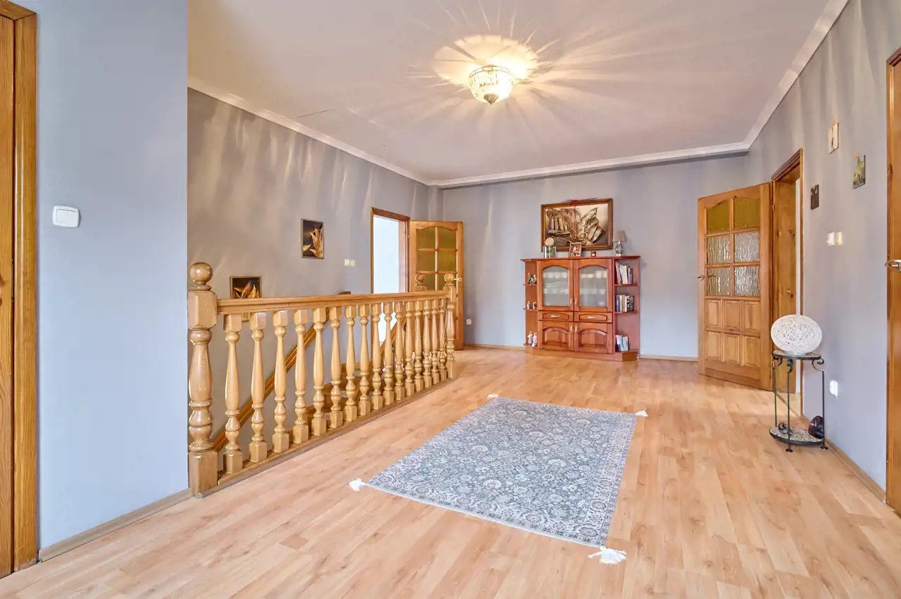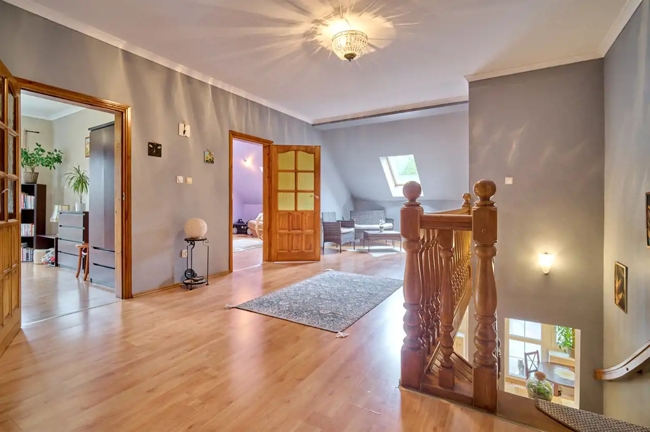Funkcjonalny układ pomieszczeń z wyraźnym podziałem na strefę dzienną i prywatną – łącznie 5 pokoi, w tym duża sypialnia oraz gabinet, przestronna kuchnia z jadalnią, 2 łazienki oraz dodatkowa toaleta.