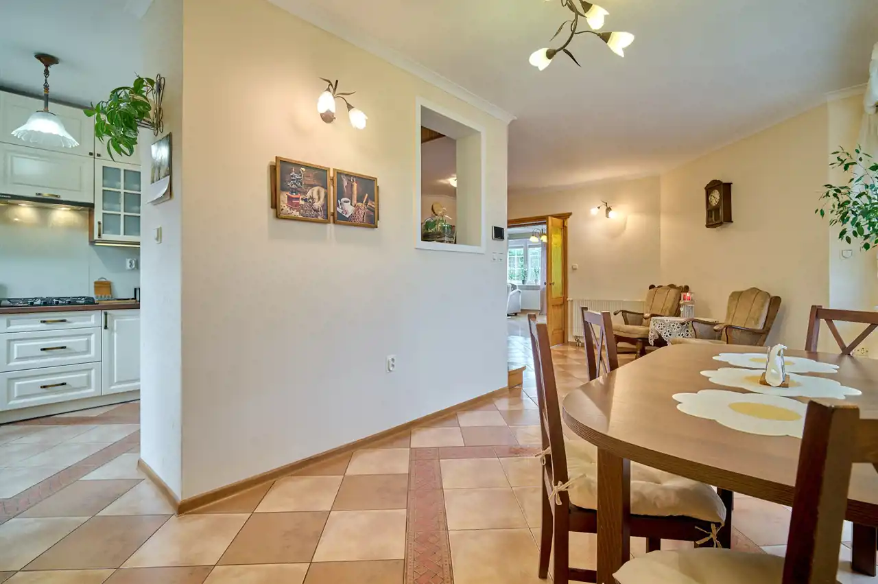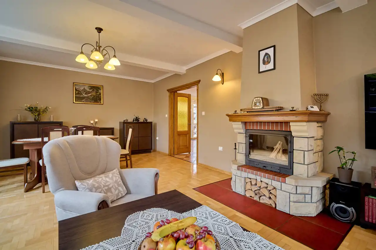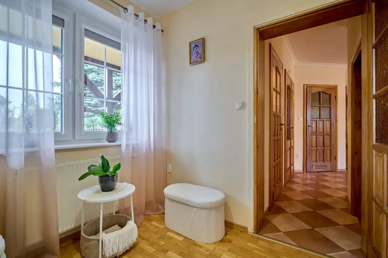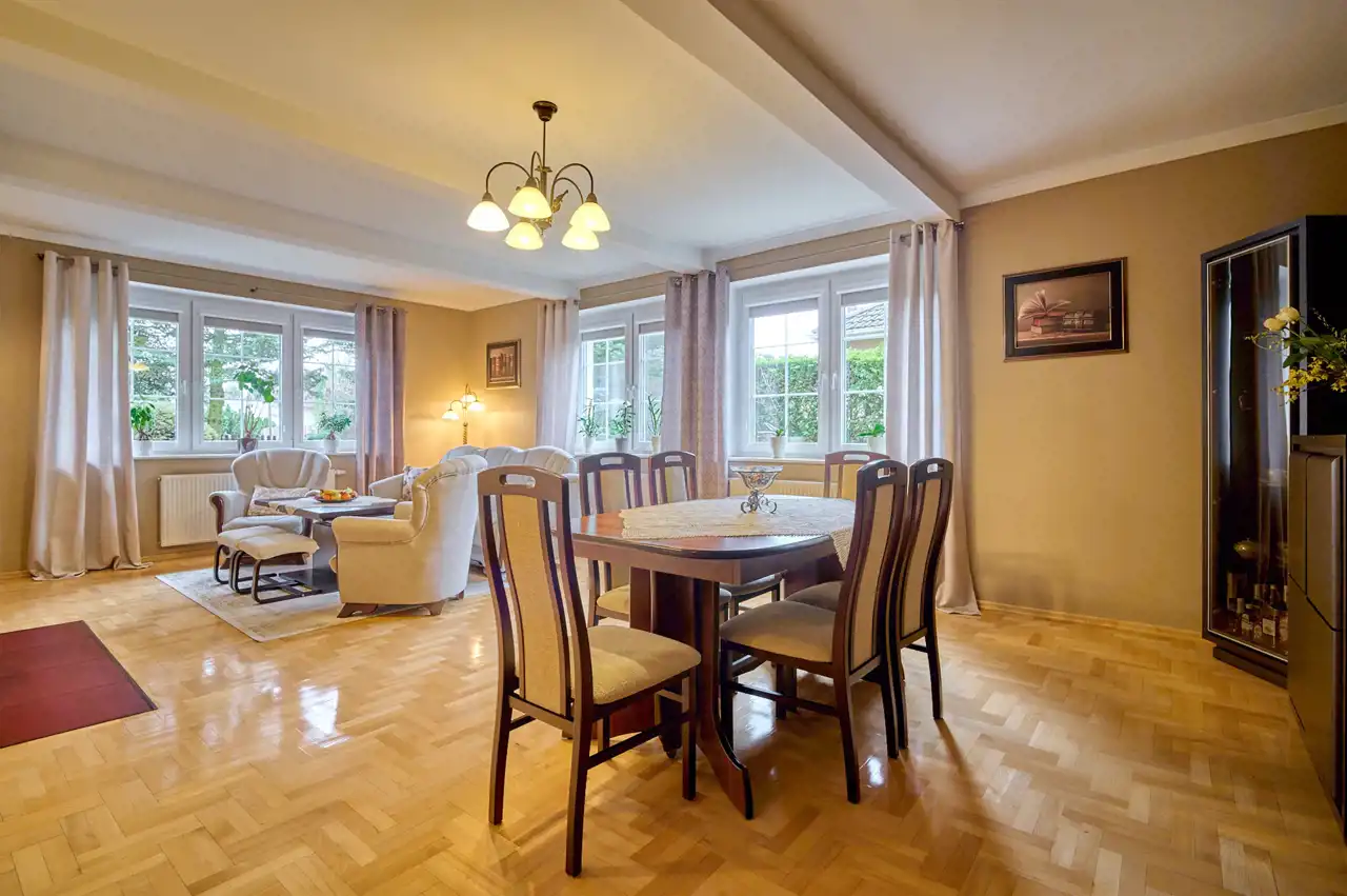 Funkcjonalny układ pomieszczeń z wyraźnym podziałem na strefę dzienną i prywatną – łącznie 5 pokoi, w tym duża sypialnia oraz gabinet, przestronna kuchnia z jadalnią, 2 łazienki oraz dodatkowa toaleta.