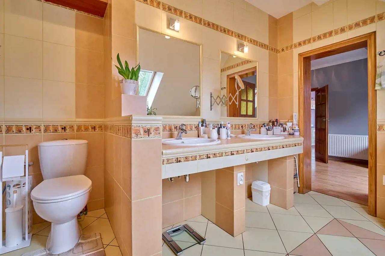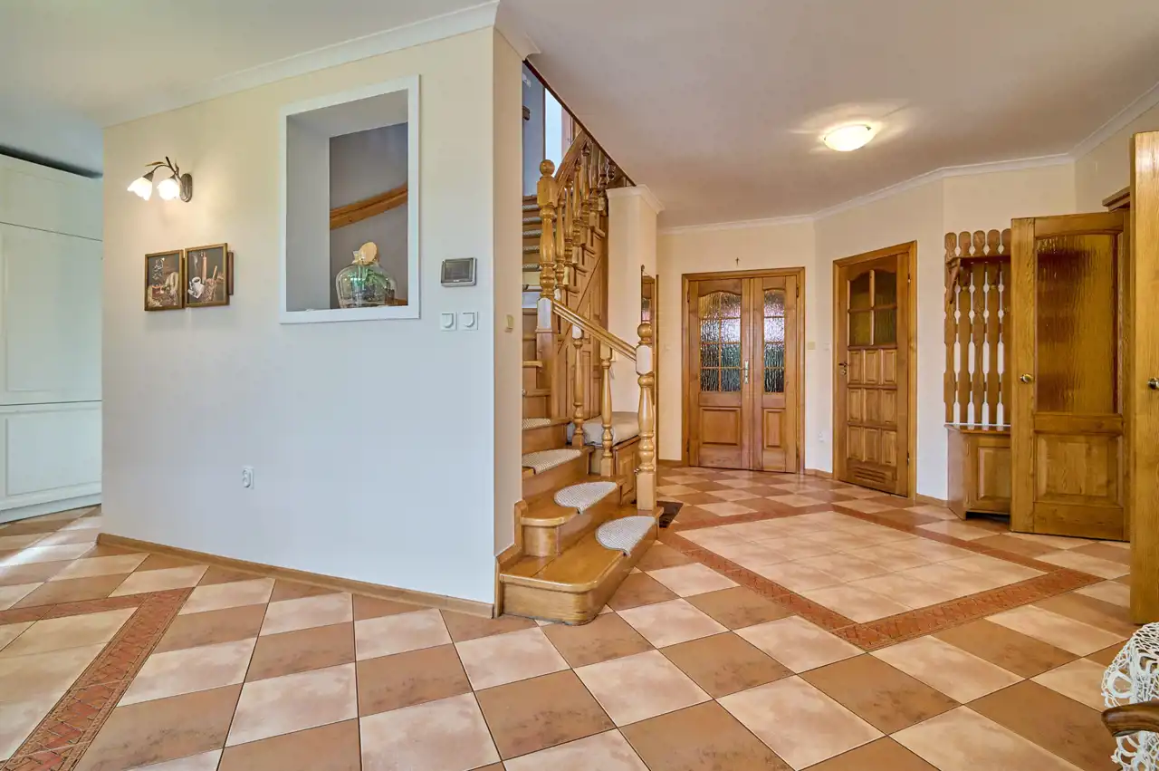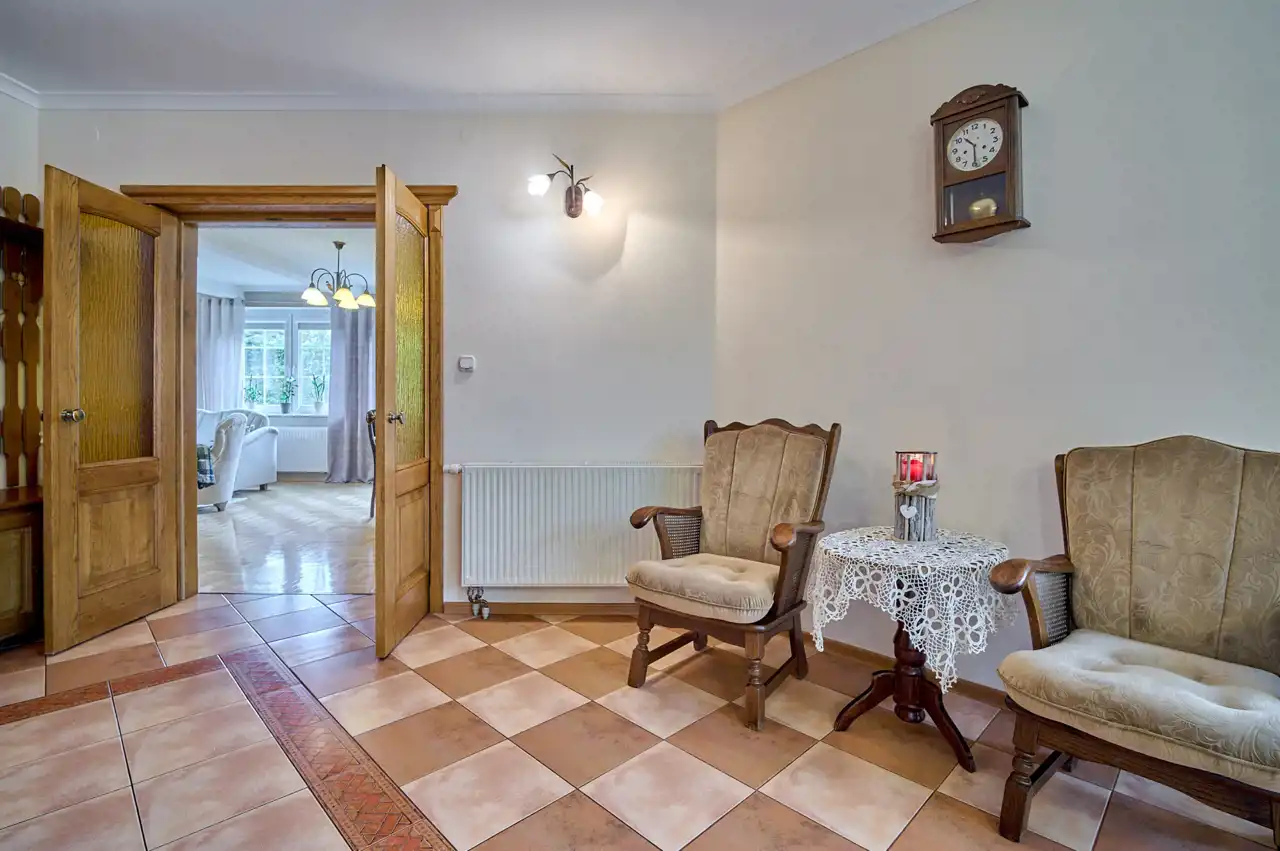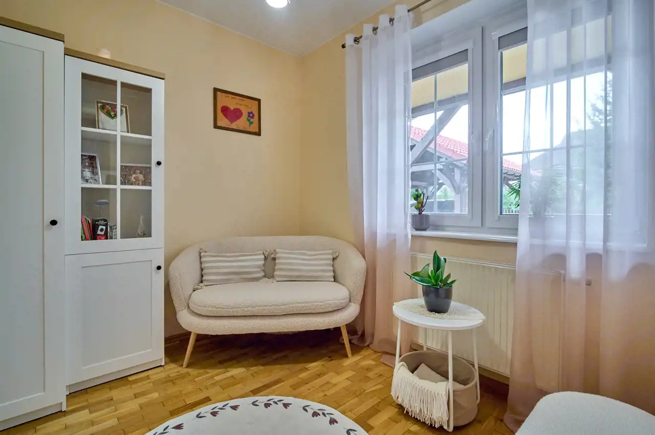 Funkcjonalny układ pomieszczeń z wyraźnym podziałem na strefę dzienną i prywatną – łącznie 5 pokoi, w tym duża sypialnia oraz gabinet, przestronna kuchnia z jadalnią, 2 łazienki oraz dodatkowa toaleta.