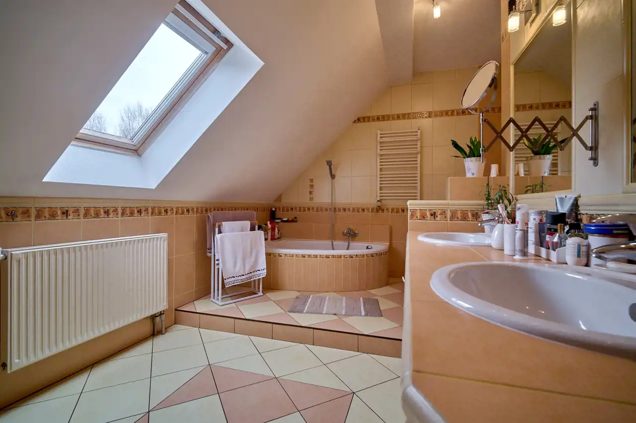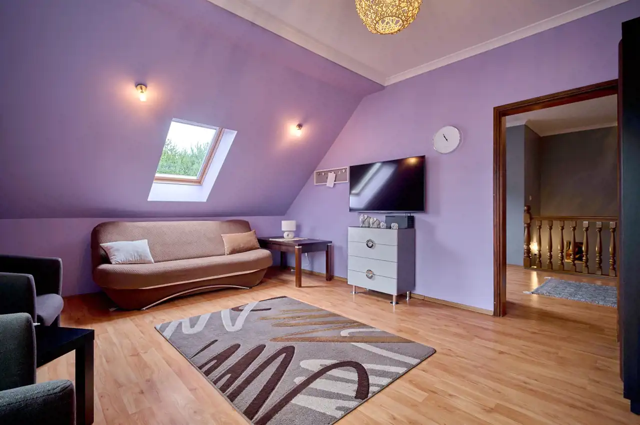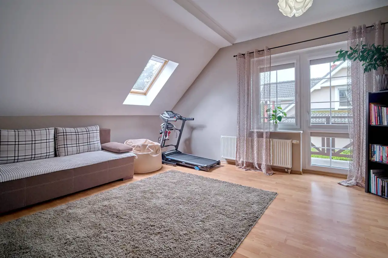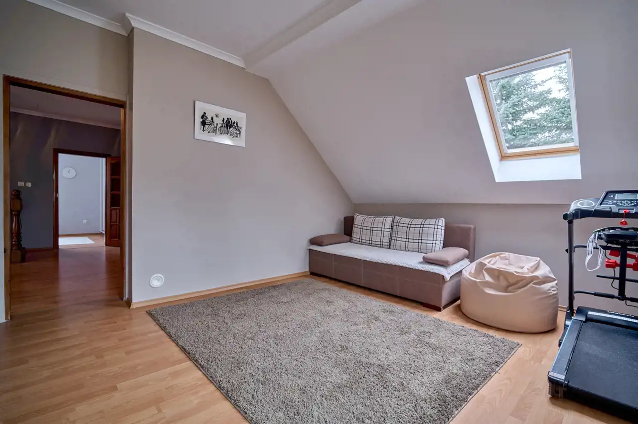 Dodatkowo na poddaszu znajdują się 2 garderoby oraz przestronny hall (24 m²) z miejscem do wypoczynku.