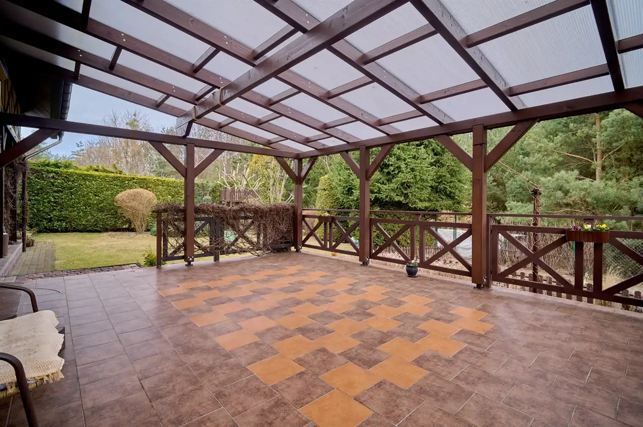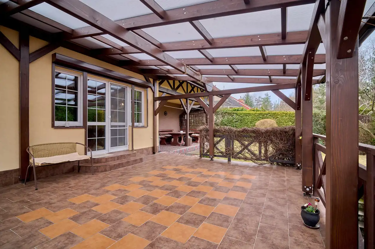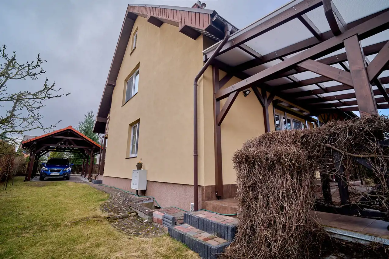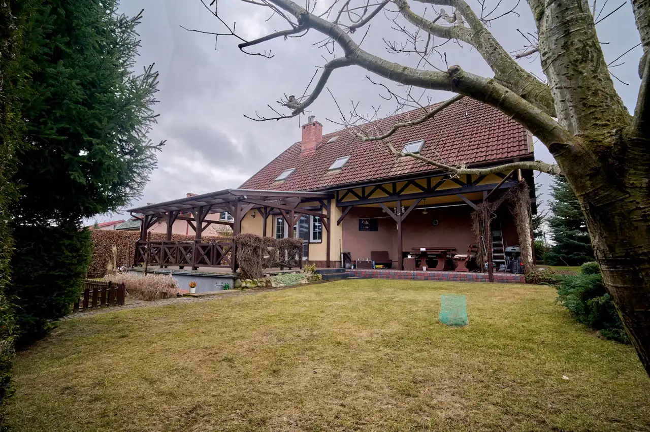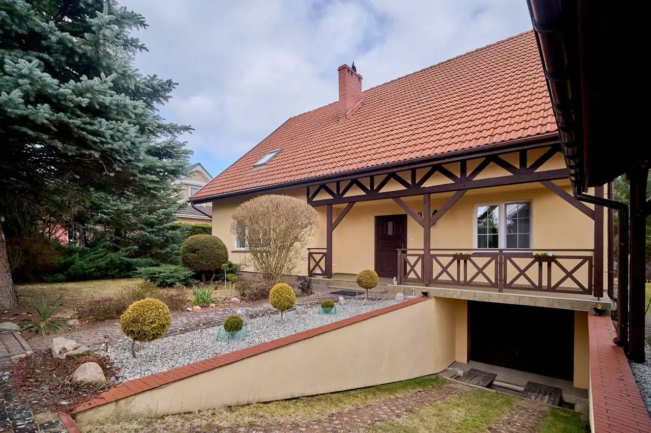 Dom jest w całości podpiwniczony – do dyspozycji m.in. garaż, kuchnia letnia oraz spiżarnia.