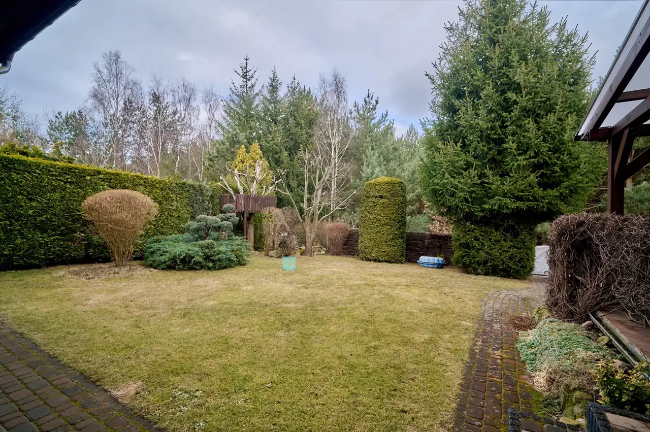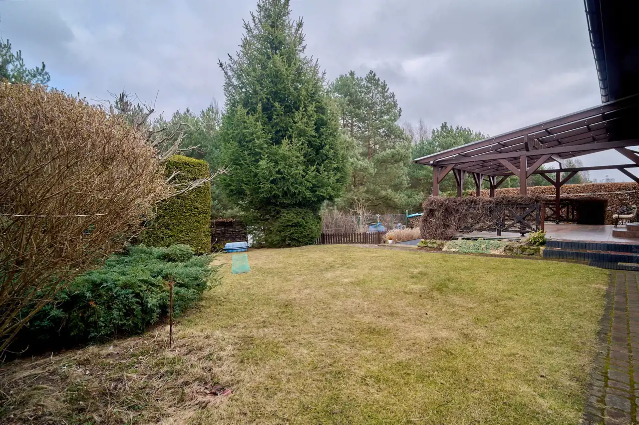 Na szczególną uwagę zasługuje pięknie zagospodarowany ogród – liczne krzewy, drzewa, nasadzenia tui wokół działki, a także drzewka owocowe i ogródek warzywny. Od strony lasu zainstalowano monitoring.