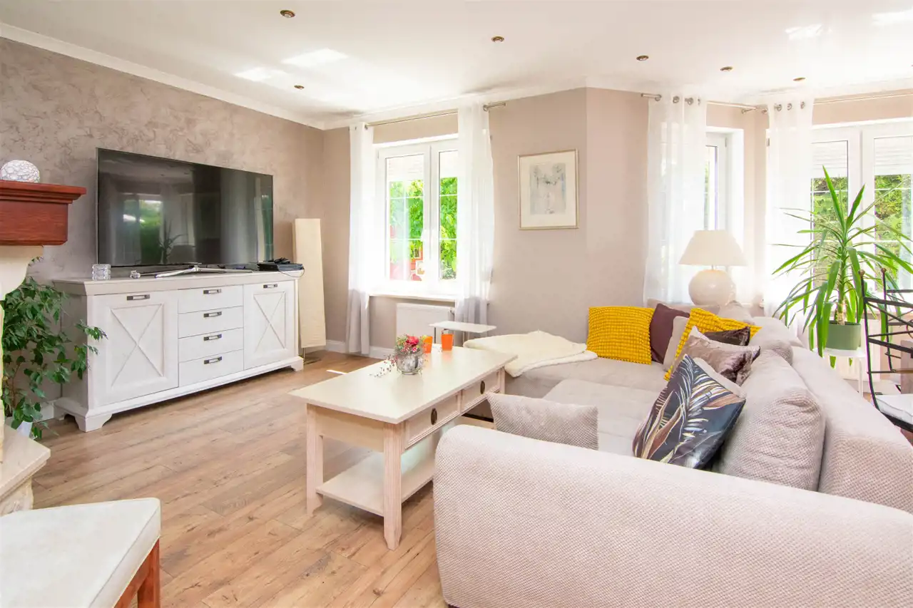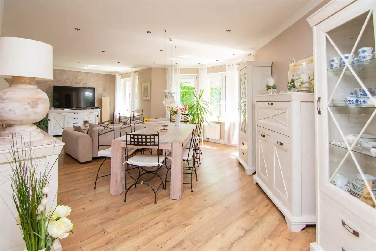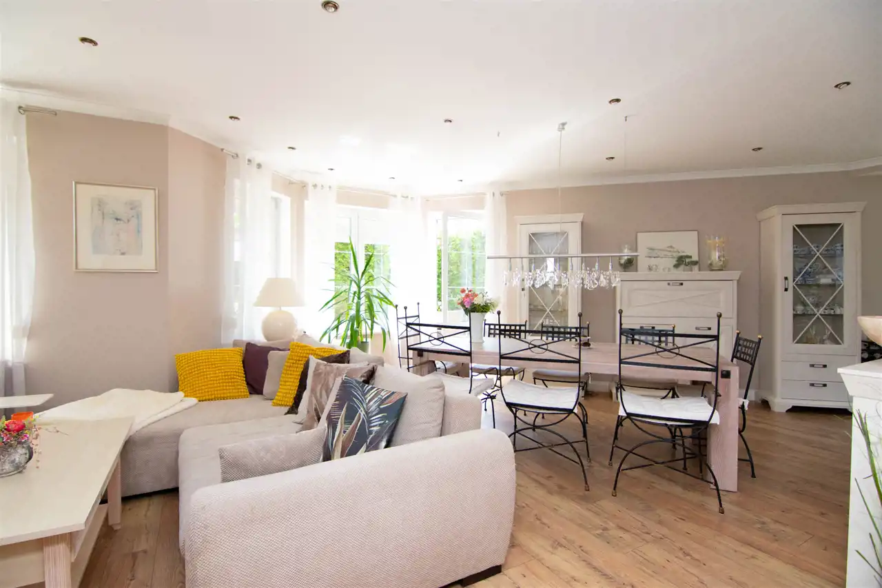 Przestronny salon z jadalnią – jasny, z dużymi oknami i wyjściem do ogrodu.