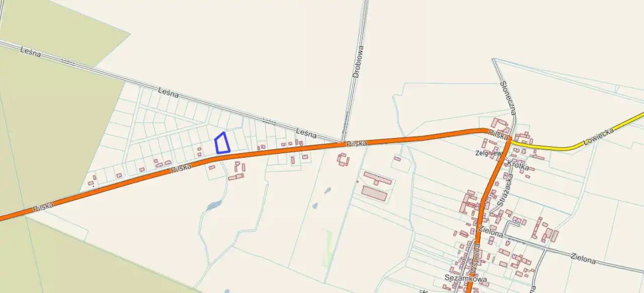 Przedmiotem oferty jest działka niezabudowana o pow. 1869 m2 w kształcie trapezu.