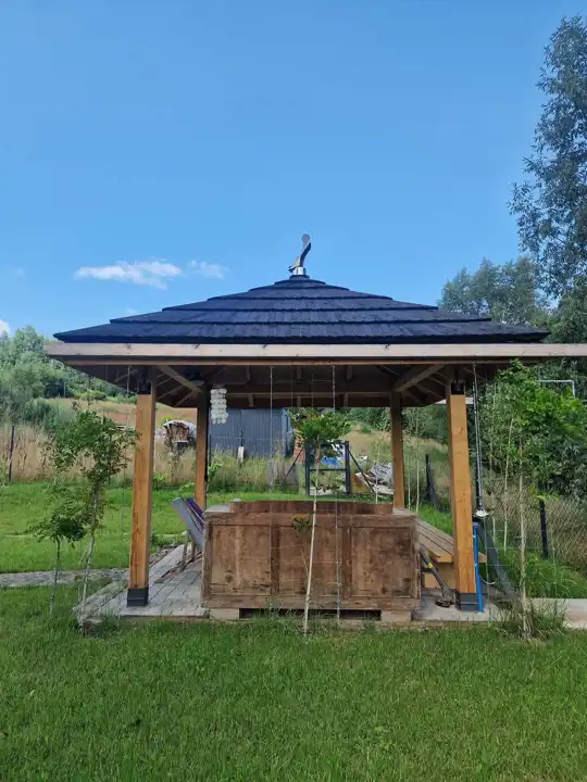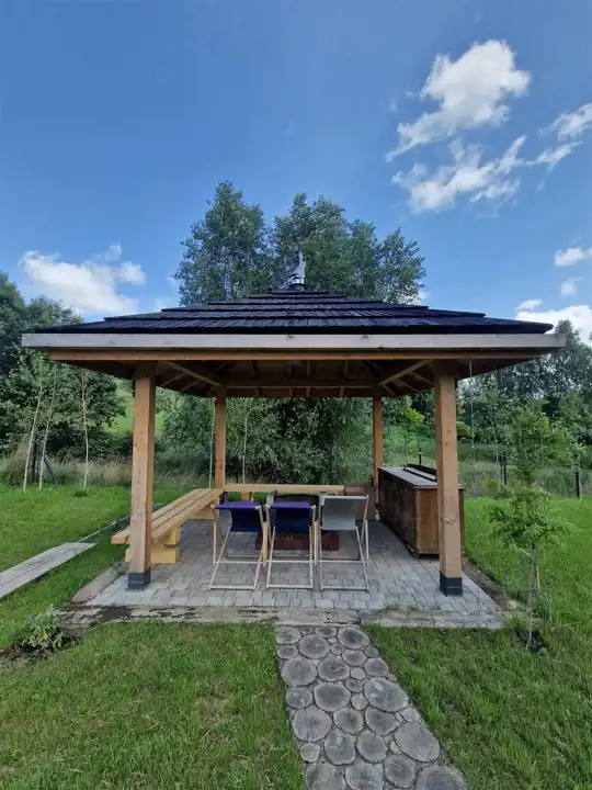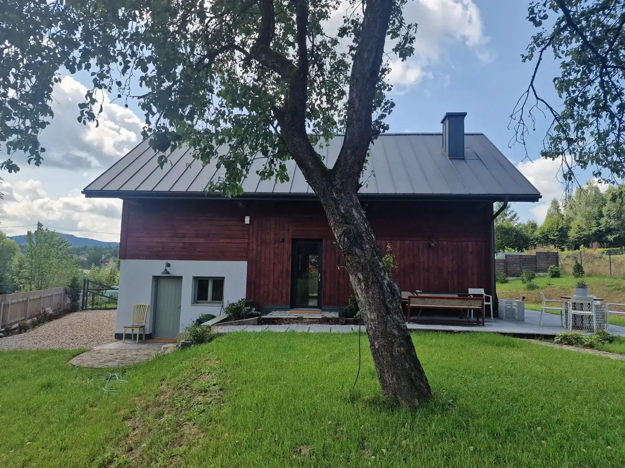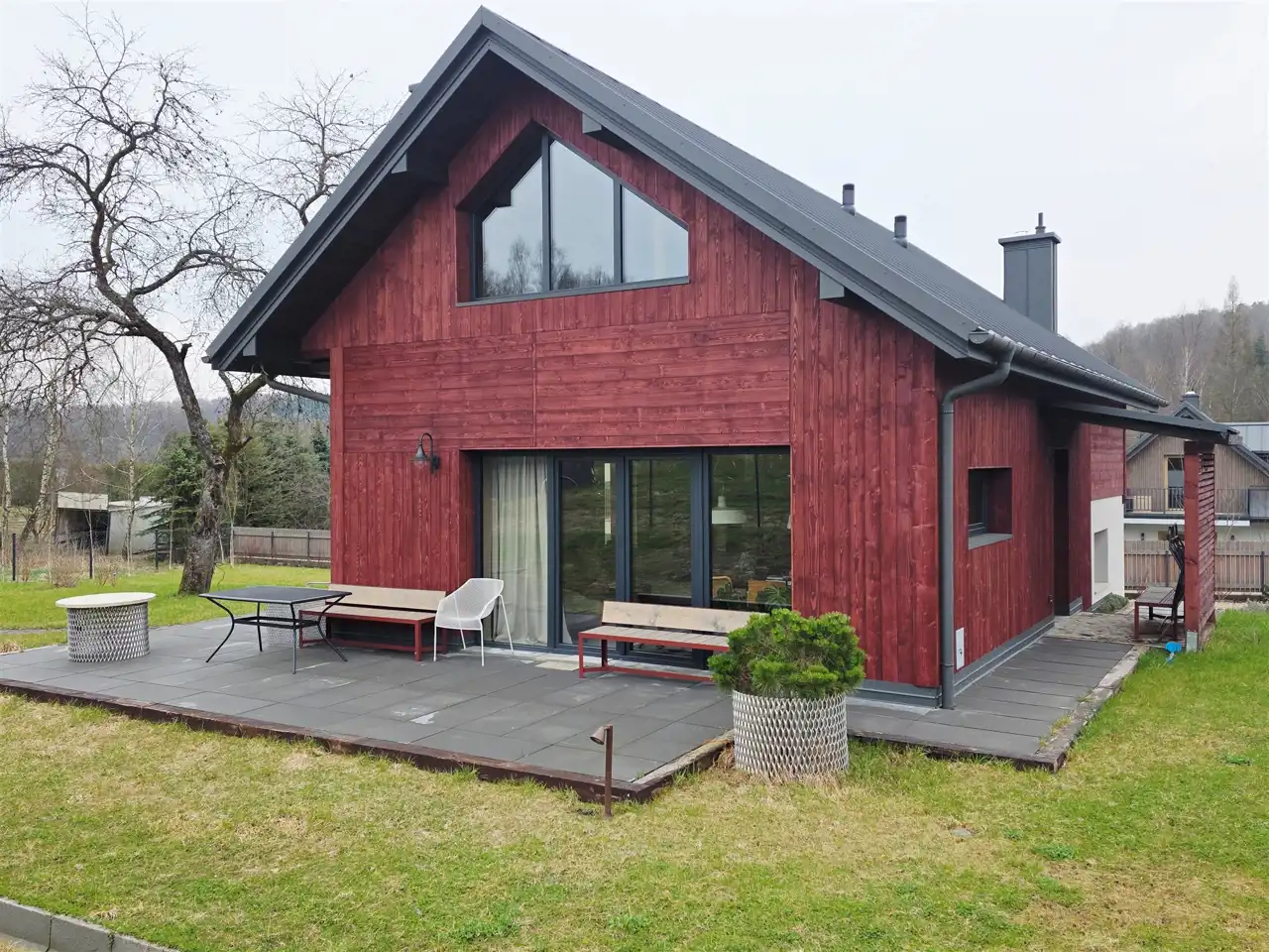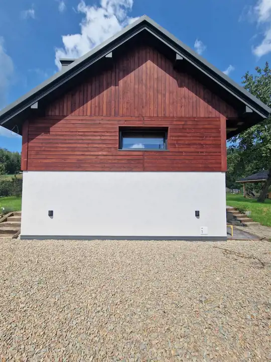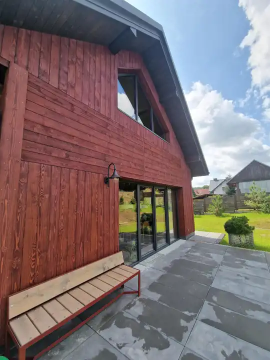 Dodatkową powierzchnią, która została zaaranżowana przez znaną krakowską firmę projektową oraz wybitnego wykonawcę w powstawaniu takich domów, stał się taras okalający 1/2 domu z powierzchnią około 50 m2. Tuż obok tarasu powstała zadaszona wiata, oaza relaksu z umiejscowionym centralnie paleniskiem które ma służyć za miejsce odpoczynku ale też eventom rodzinnym lub wraz ze znajomymi.