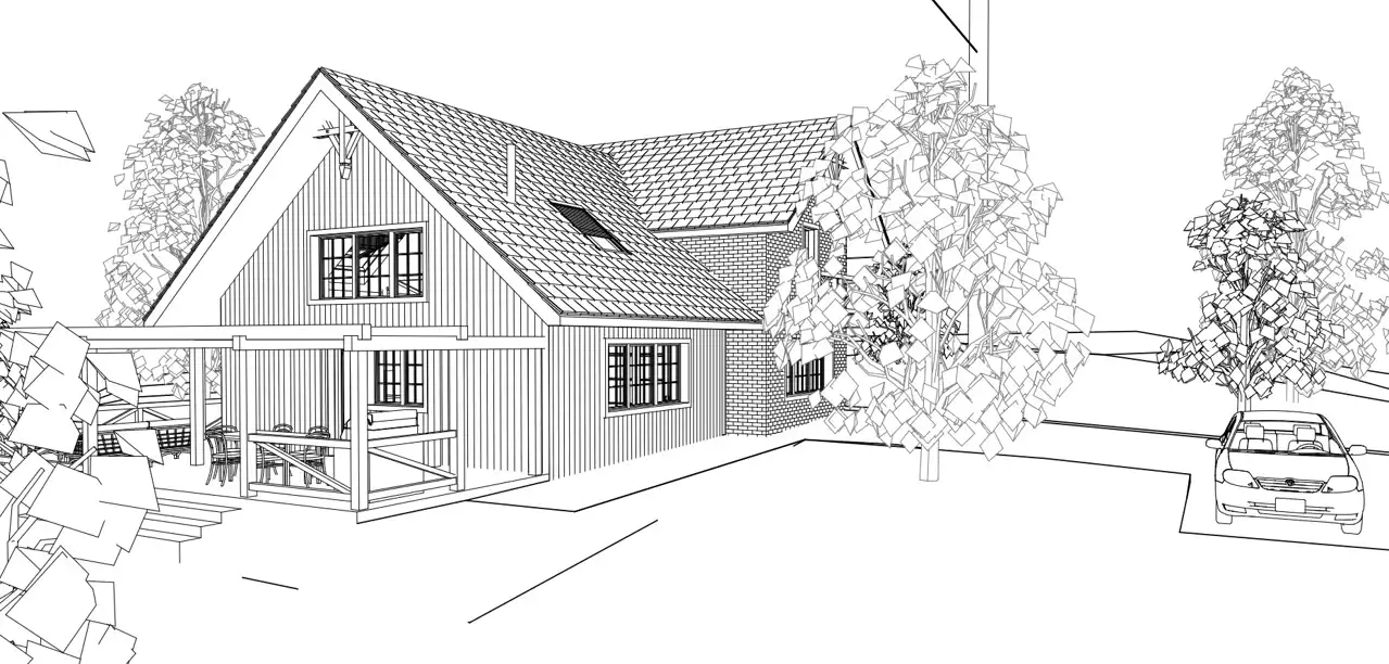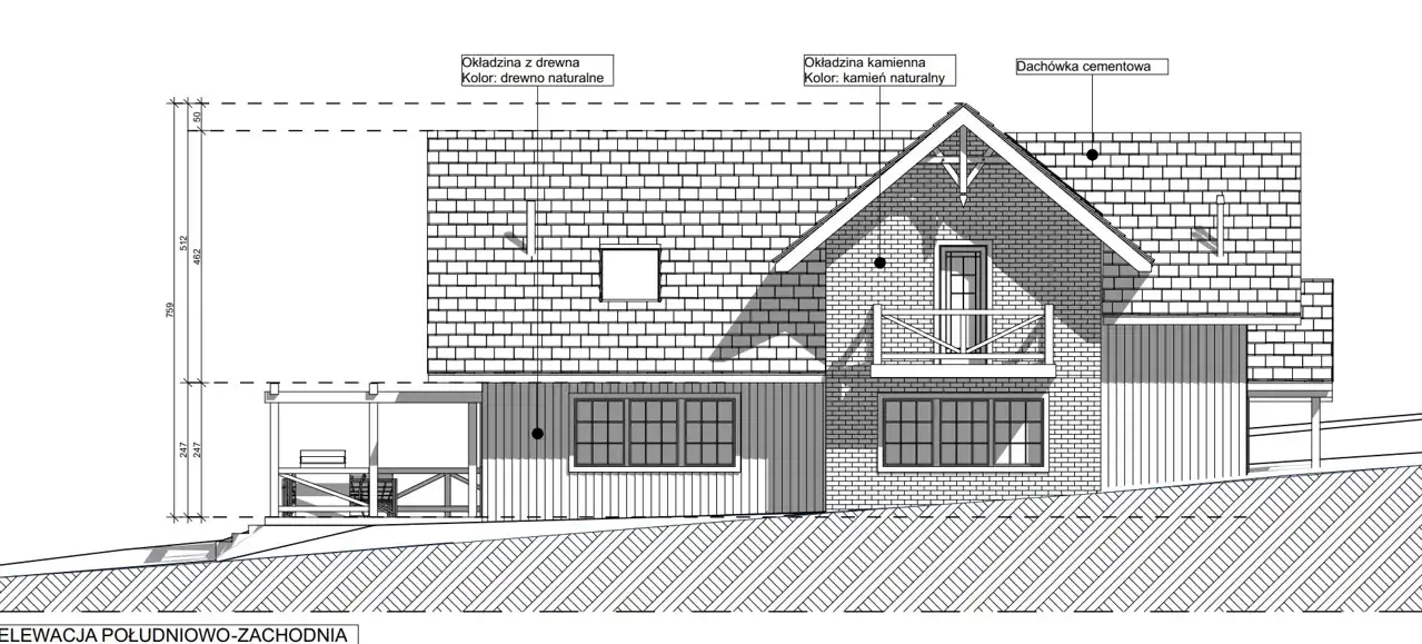 Dom wybudowany w technologii tradycyjnej. Ściany konstrukcyjne murowane z pustaka Porotherm 25 na zaprawie (pustak oryginalny). Ławy fundamentowe wylewane z betonu. Części zewnętrzne budynku stanowi: elewacja wykonana z piaskowca Tenczyn łączona z deskami elewacyjnymi z modrzewia, pozostała część to tynk elewacyjny Mapey w kolorze jasny popiel. Docieplenie - styropian Austroterm 15 cm. Okna PCV 3-szybowe, drewnopodobne firmy Drutex. Drzwi zewnętrzne drewniane, dębowe. Dach kryty dachówką ceramiczną marsylka o kolorze Angoba brąz. To co wyróżnia dachówkę marsylkę to charakterystyczne dwie muldy na dachówce. Takie wyżłobienia sprawiają, że marsylka zapewnia imponujący efekt wizualny.