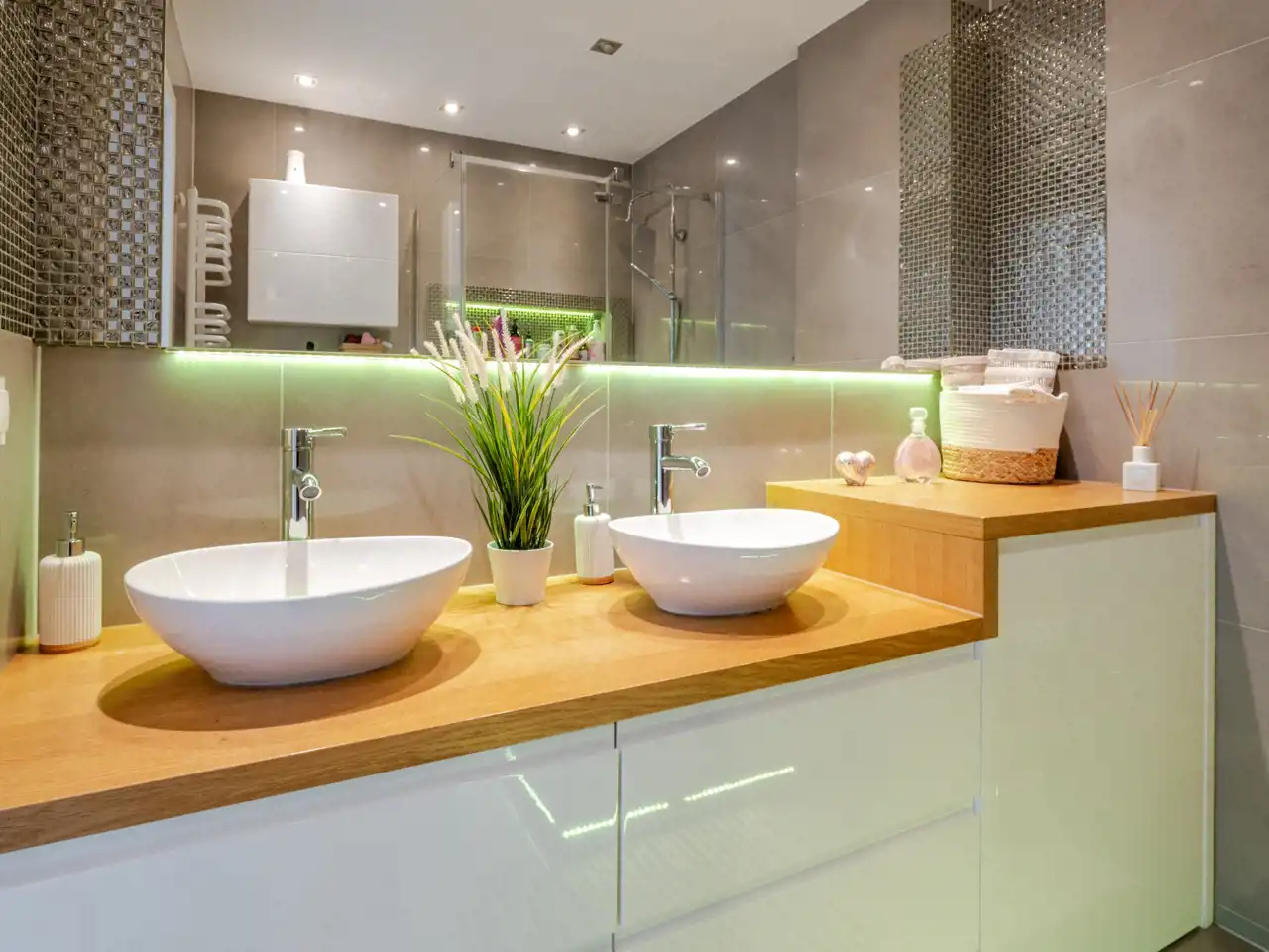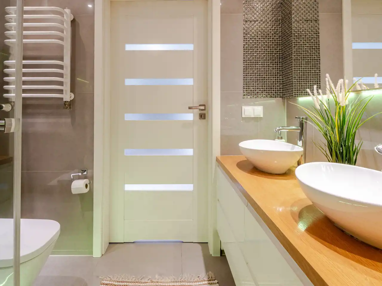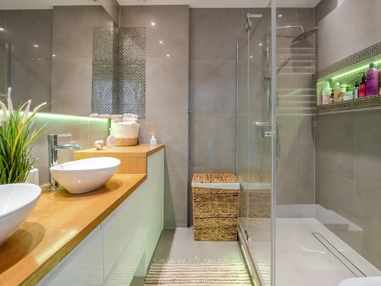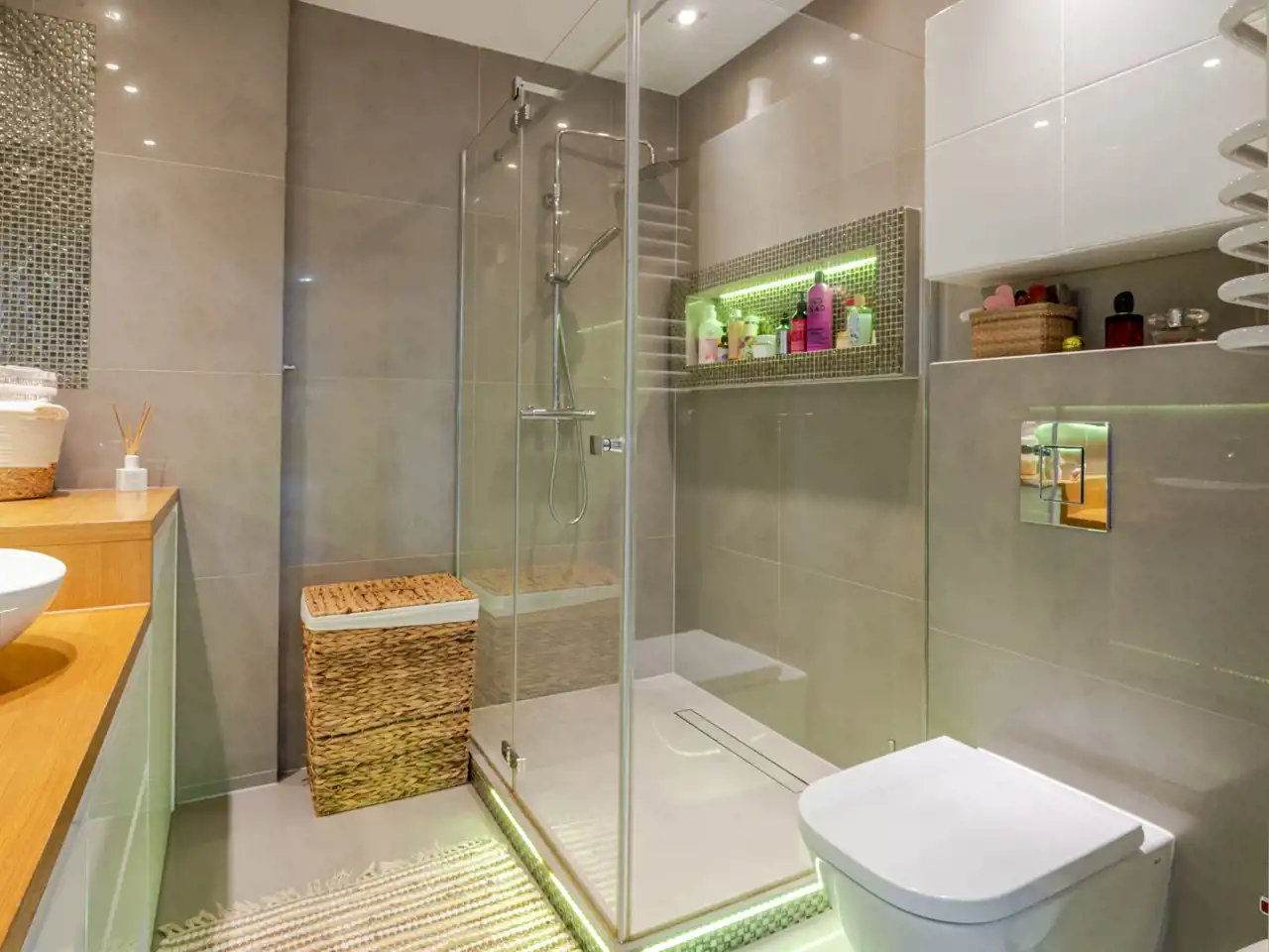 elegancka łazienka z przestronną kabiną prysznicową.