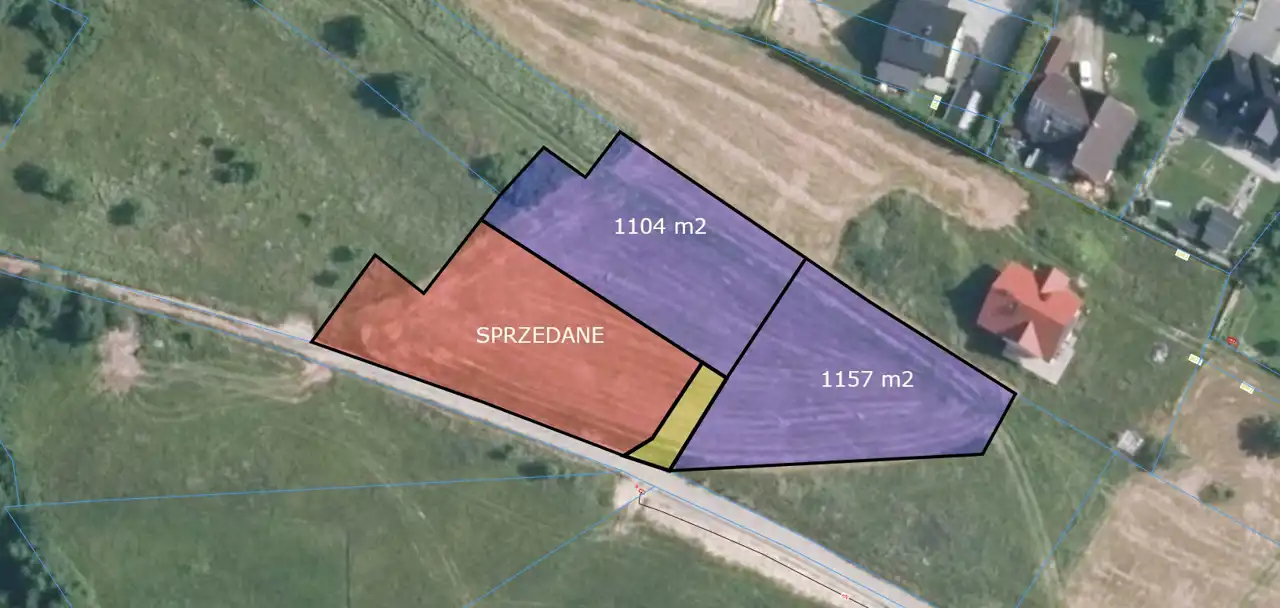 Do wyboru nabywcy jest jedna z dwóch widocznych na mapie działek o następujących powierzchniach: 1104 m2, 1157 m2. Do działek prowadzi szeroka (5-metrowa) droga wewnętrzna, która połączy je z drogą gminną.