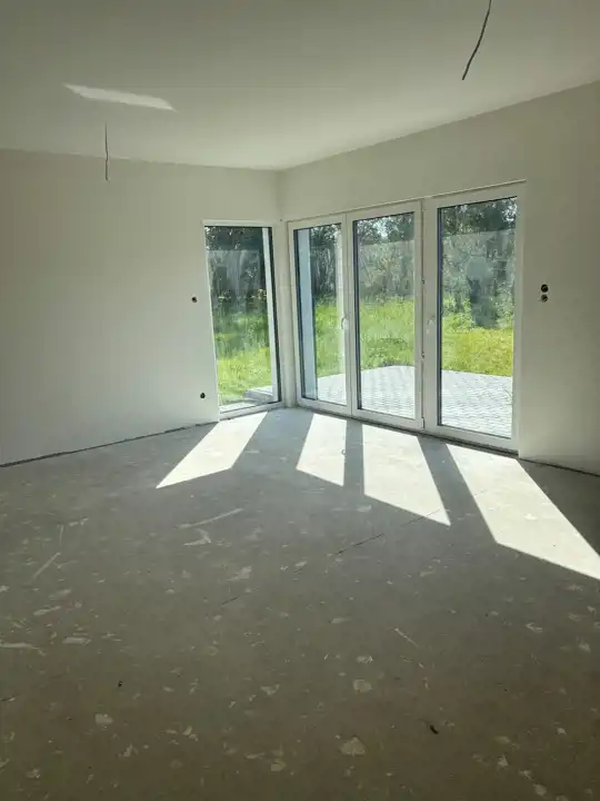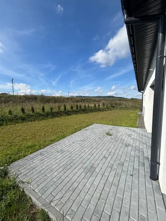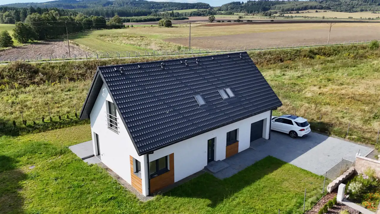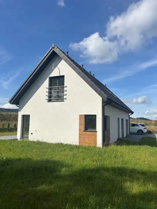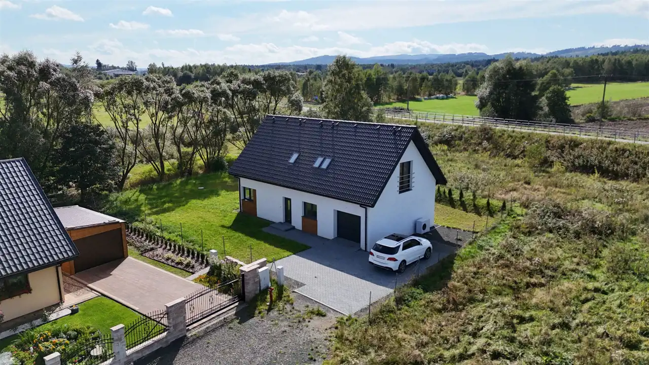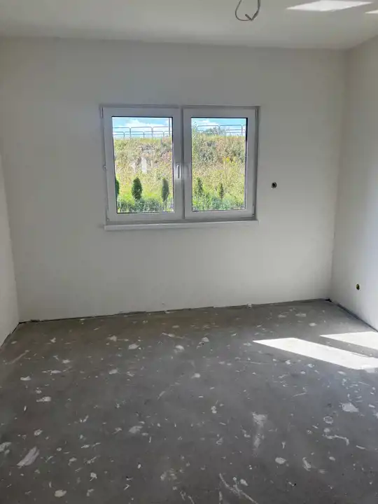 Stolarka PCV - 3 szybowa, rozłożono instalację ogrzewania podłogowego, na podłogach wylewka. W całym domu położono instalację energetyczną, wodną i kanalizacyjną, na ścianach gładzie pomalowane farba podkładową. Pomieszczenia ogrzewane pompą ciepła zasilaną panelami fotowoltaicznymi. Ściany wykonane z prefabrykowanych elementów keramzytowych, ocieplone styropianem Termo Organika Dalmatyńczyk o przenikalności termicznej 𝜆 =0,042 W/mK. Tynk akrylowy Termo Organika
