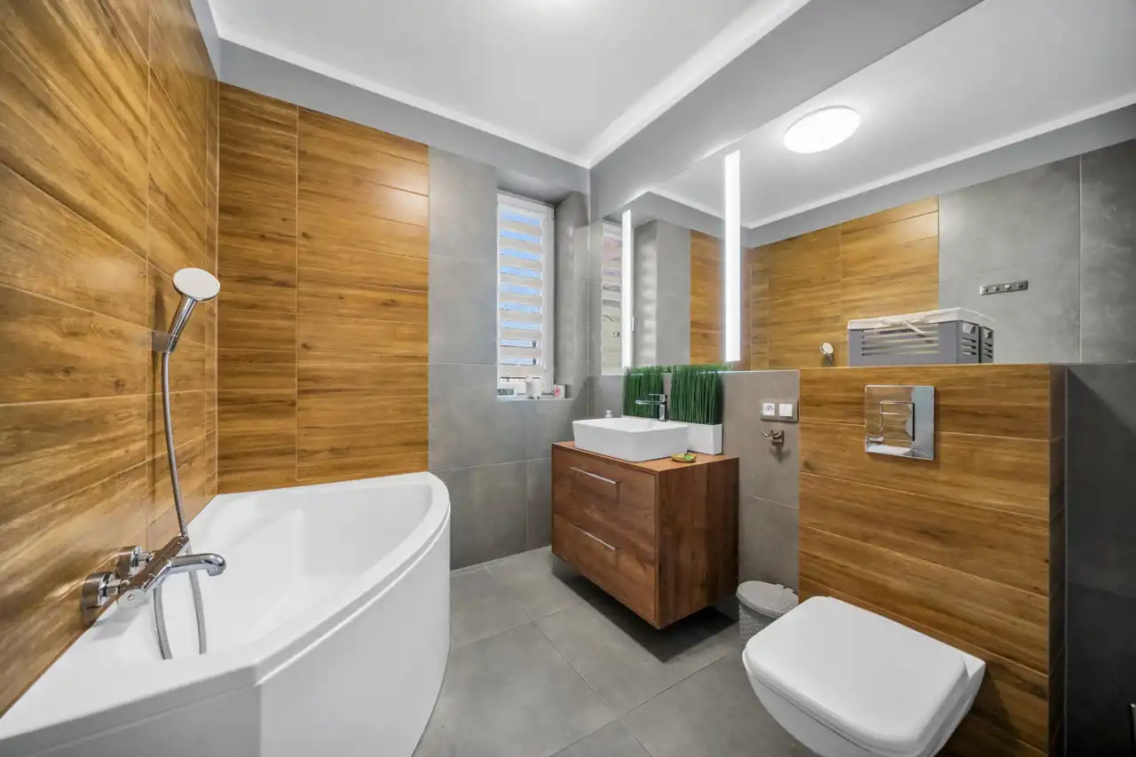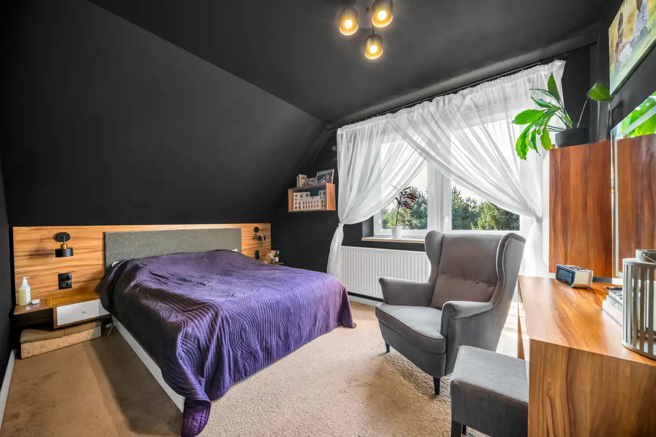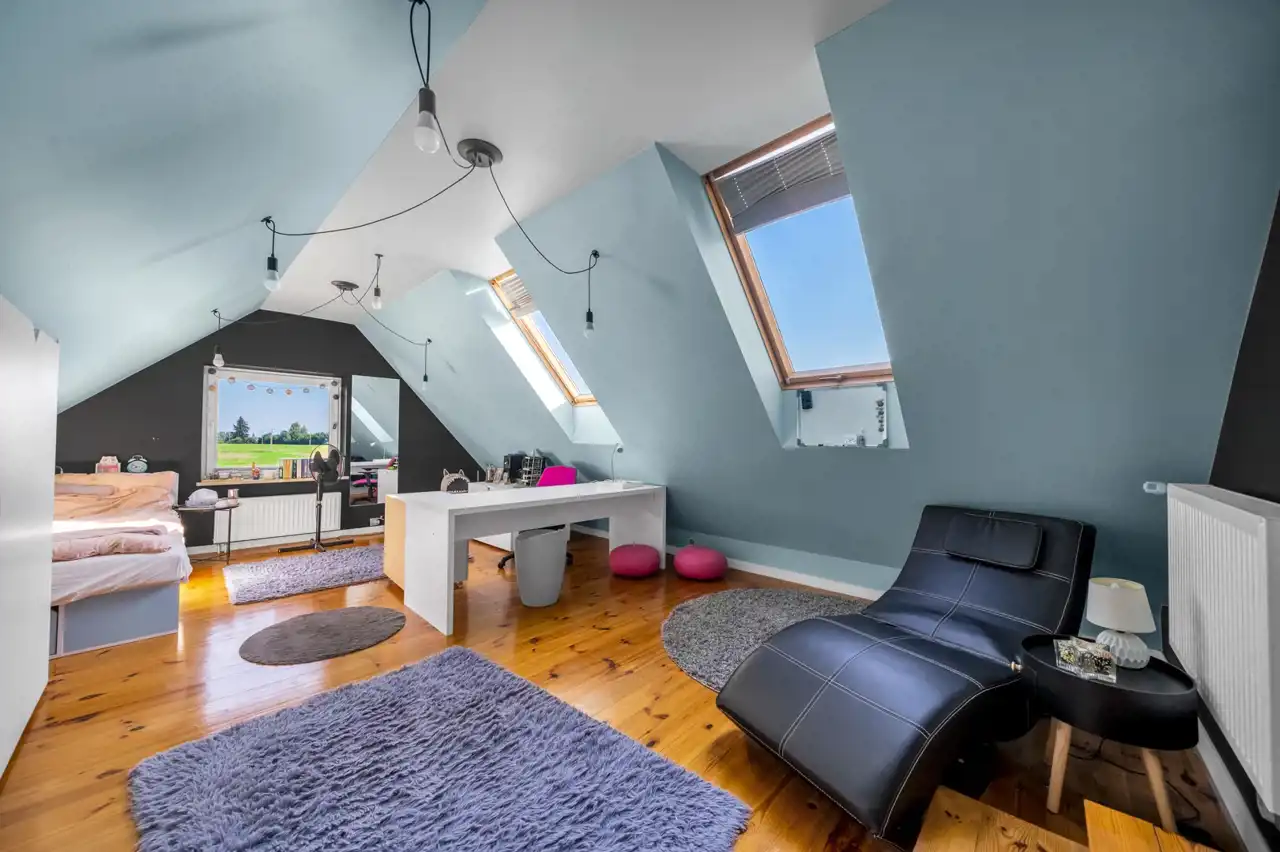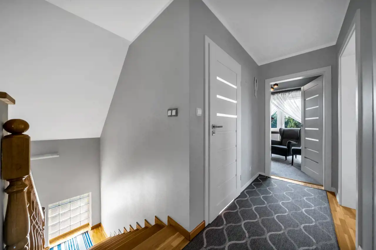 Dom wykonany z cegły porotherm 30 cm, ocieplony styropianem 10 cm – świetna izolacja cieplna. Na dole podłogi wyłożone panelami i płytkami, na górze parkiet oraz wykładzina dywanowa. Ogromnym atutem jest centralna klimatyzacja obsługująca 4 pokoje na poddaszu.